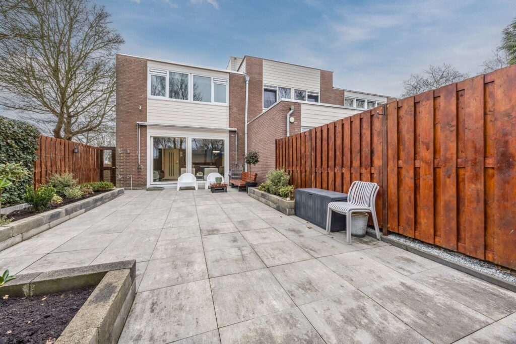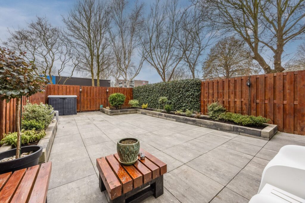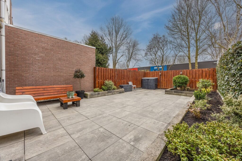 De zonnige achtertuin (ca. 67 m²) is gelegen op het zuiden, beschikt over een achterom en biedt volop privacy. De vrijstaande stenen berging is voorzien van elektra – ideaal voor fietsen en extra opslag.