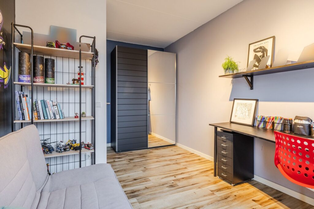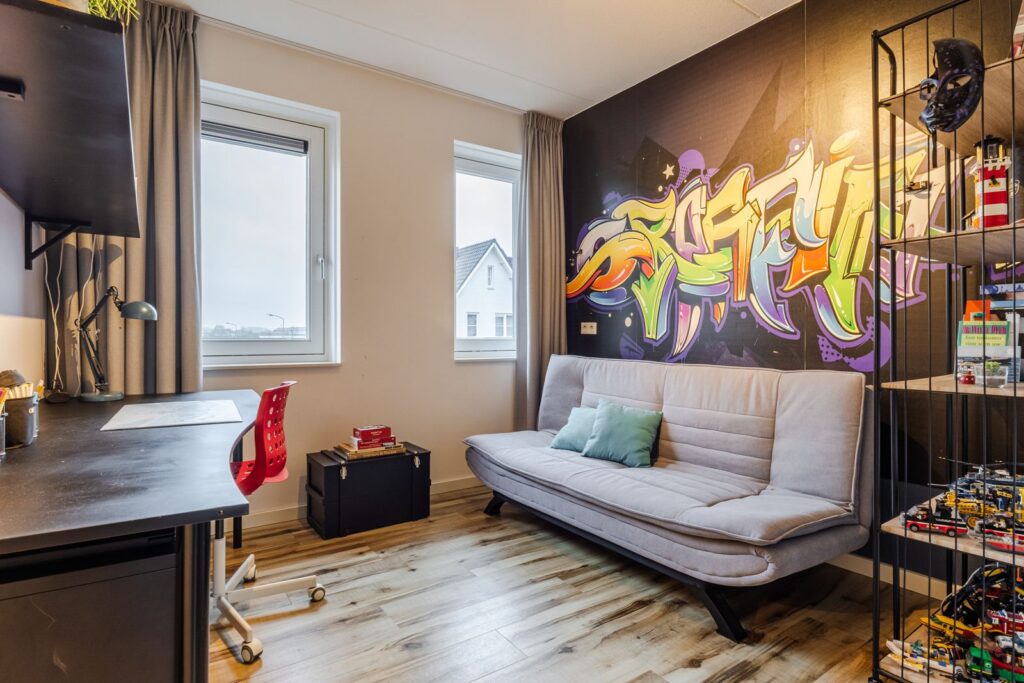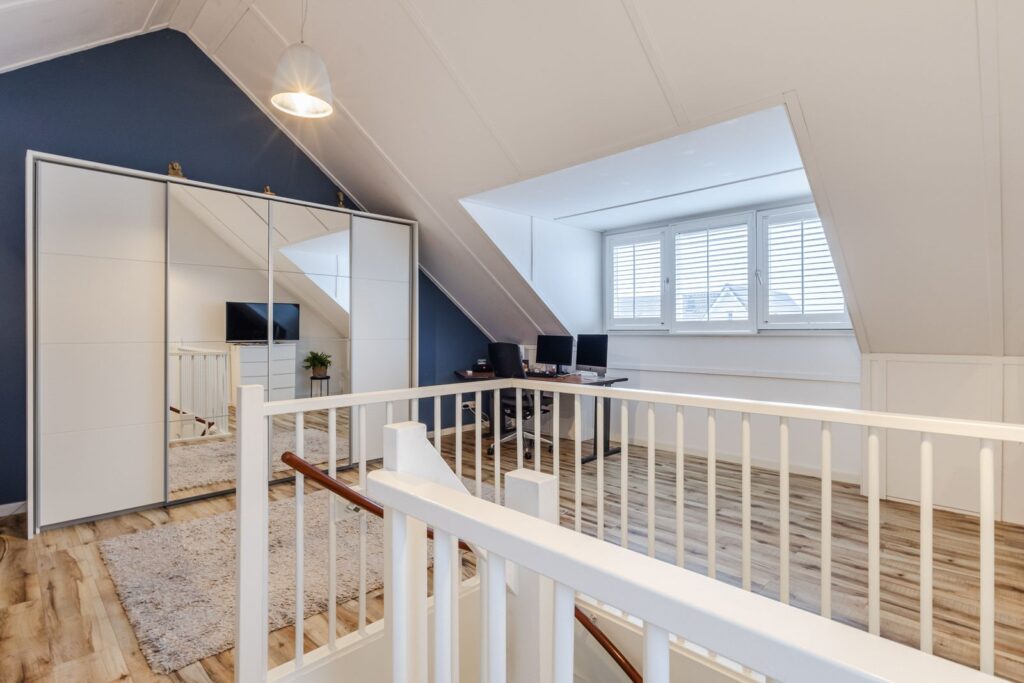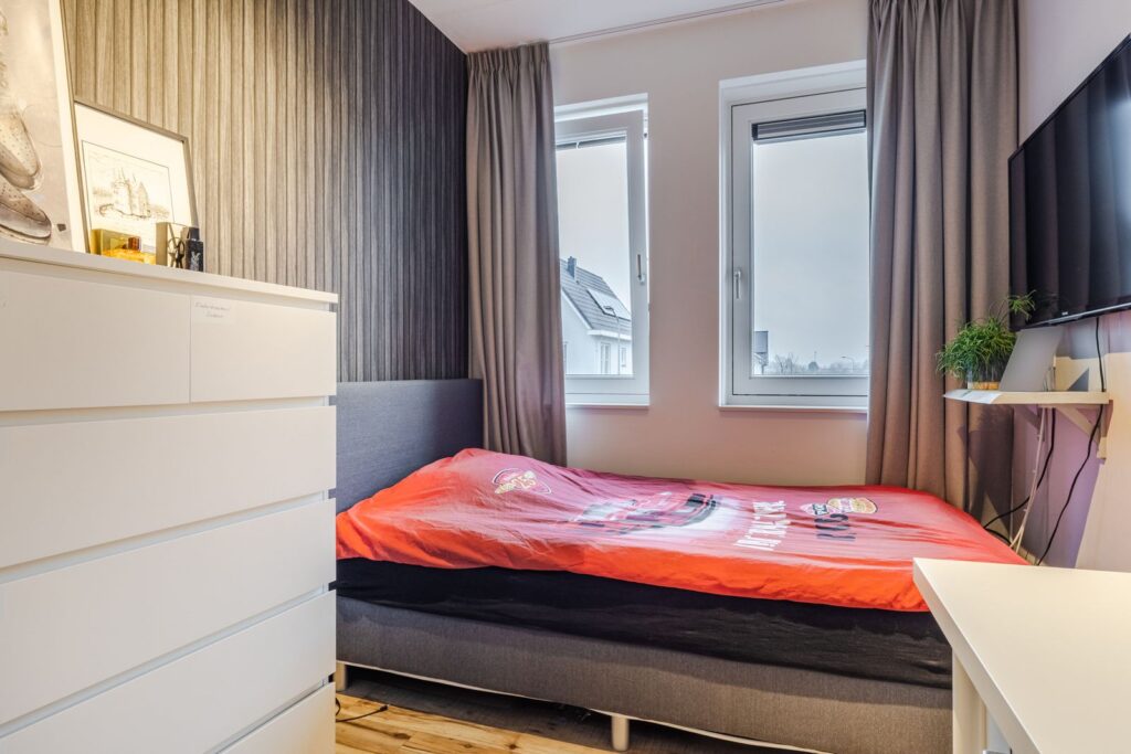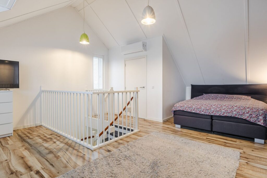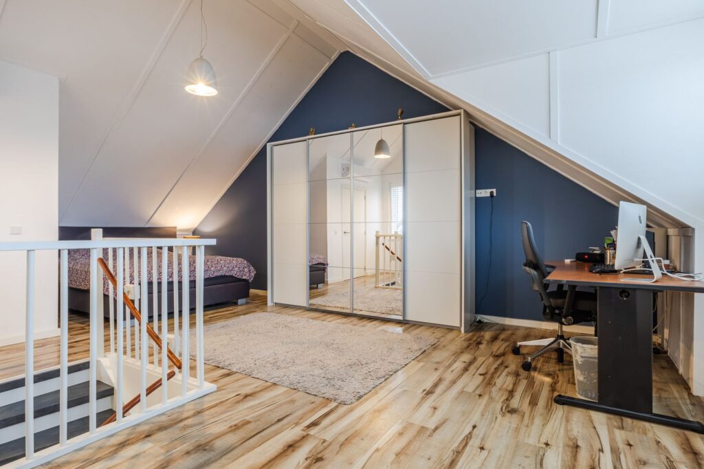 De volledig afgewerkte zolder is een veelzijdige ruimte: ideaal als slaap-, werk-, game- of hobbykamer. De dakkapel met drie ramen zorgt voor extra licht, ruimte en een schitterend uitzicht op de boomgaard richting de dijk.