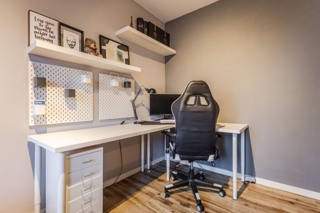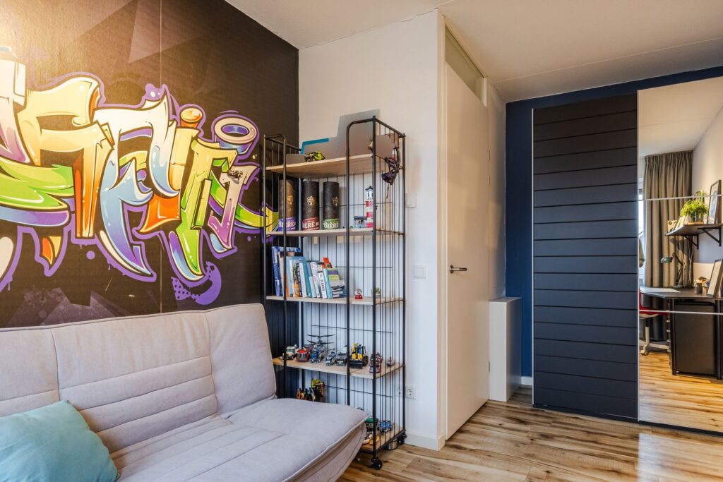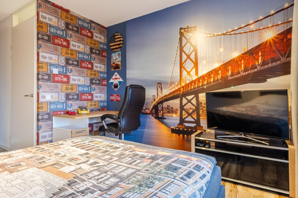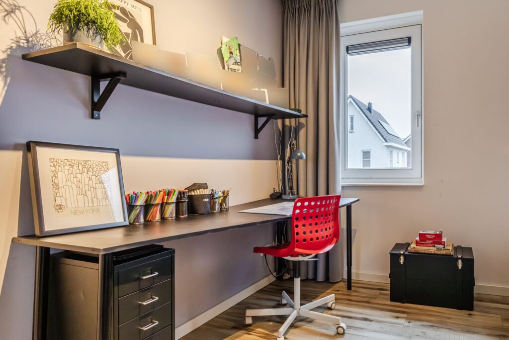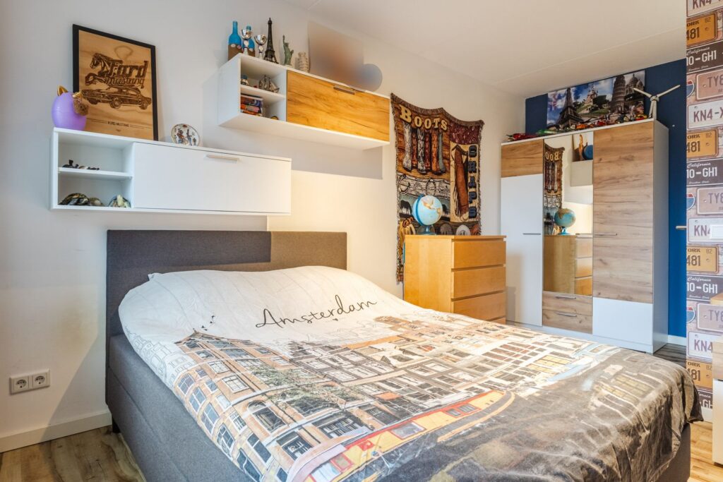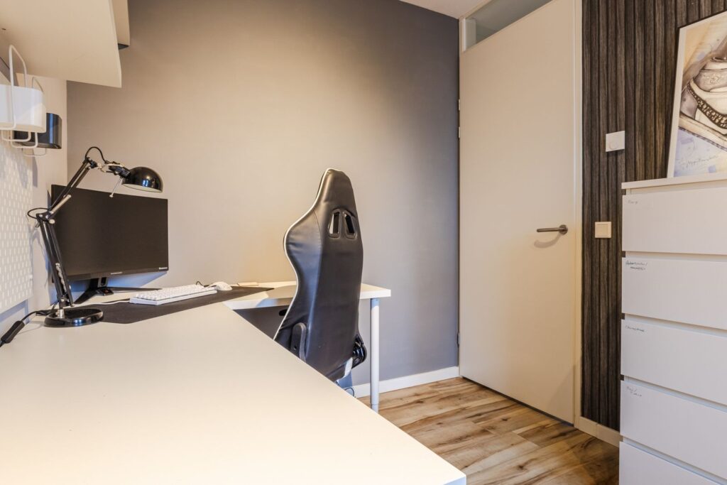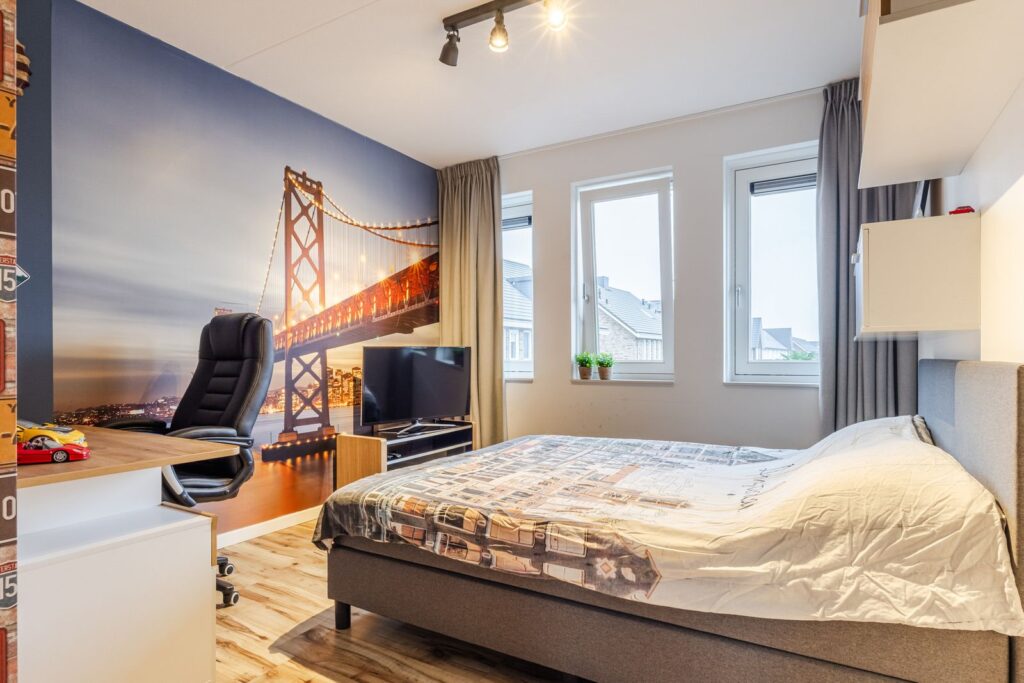 De volledig afgewerkte zolder is een veelzijdige ruimte: ideaal als slaap-, werk-, game- of hobbykamer. De dakkapel met drie ramen zorgt voor extra licht, ruimte en een schitterend uitzicht op de boomgaard richting de dijk.