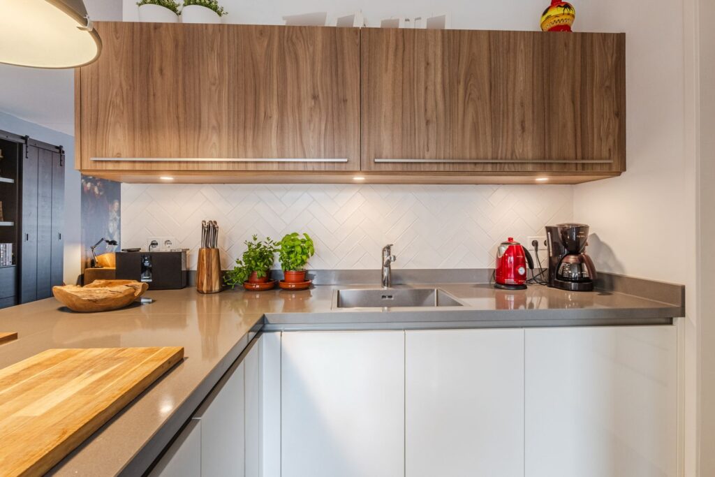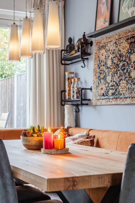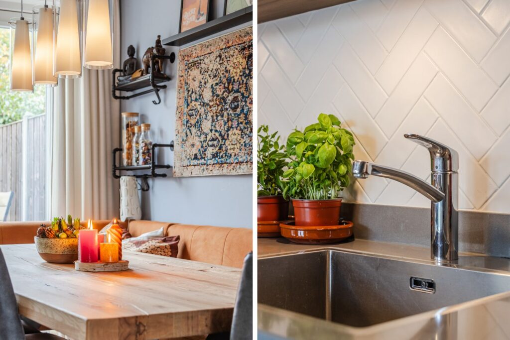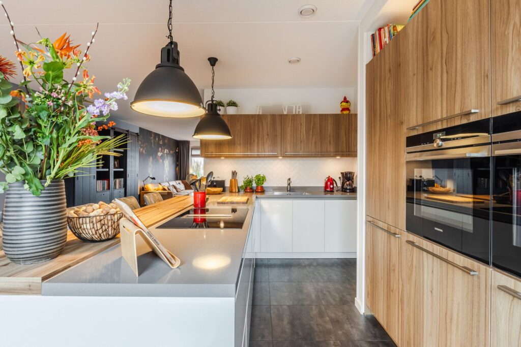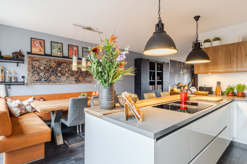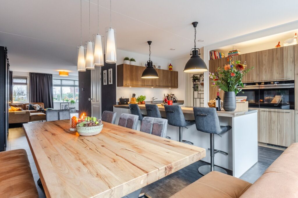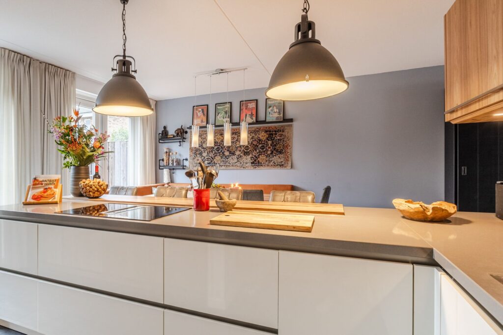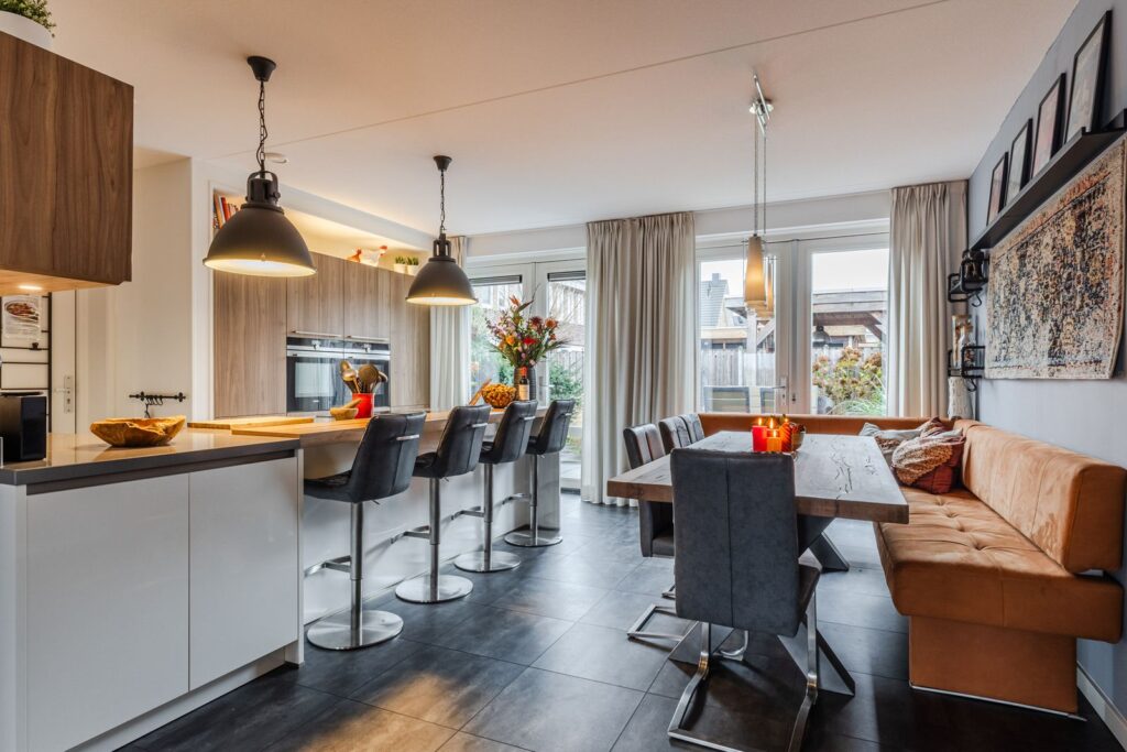 Aan de achterzijde is de woning maar liefst 2,4 meter over de volle breedte uitgebouwd, waardoor een royale leefkeuken is ontstaan. Het grote kookeiland met natuurstenen blad vormt het hart van de ruimte. Hier vind je een inductiekookplaat met ingebouwd afzuigsysteem en een gezellige bar voor vier personen, perfect voor een snel ontbijt of een vrijdagmiddagborrel.