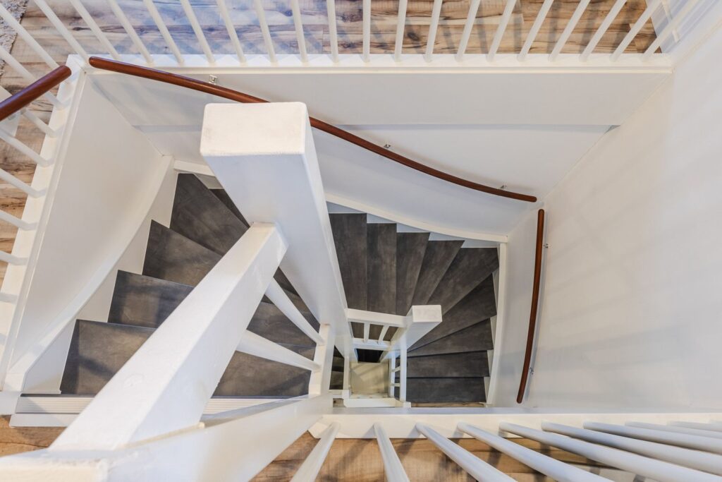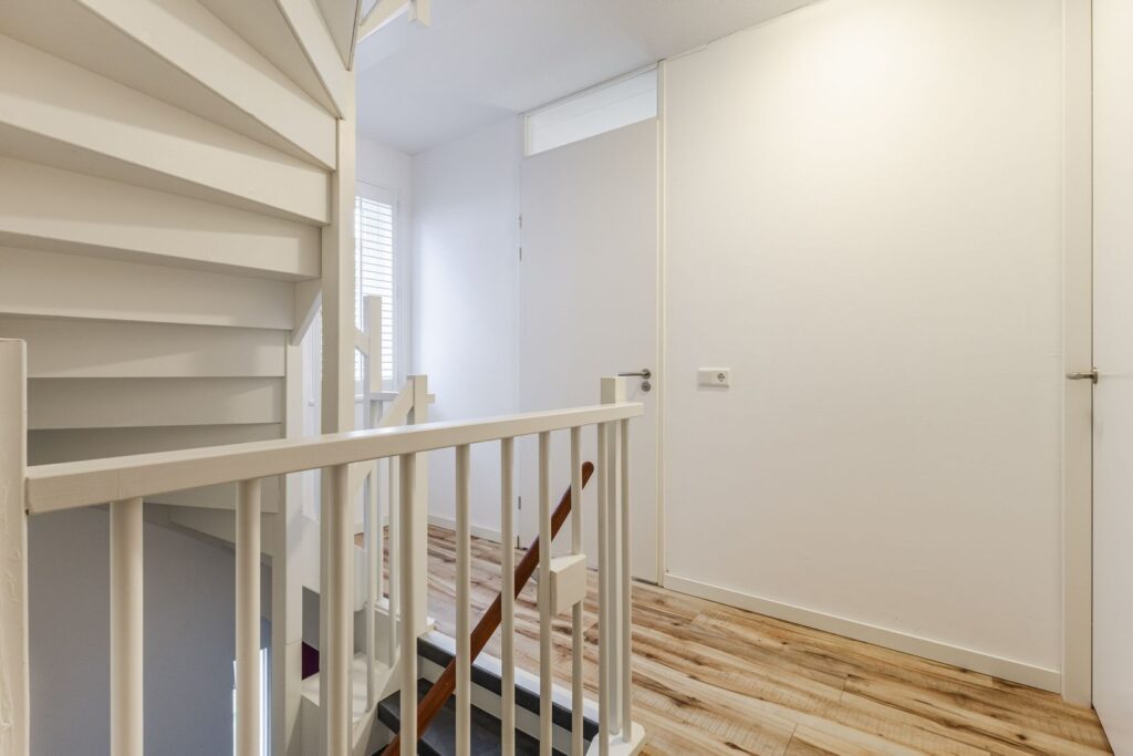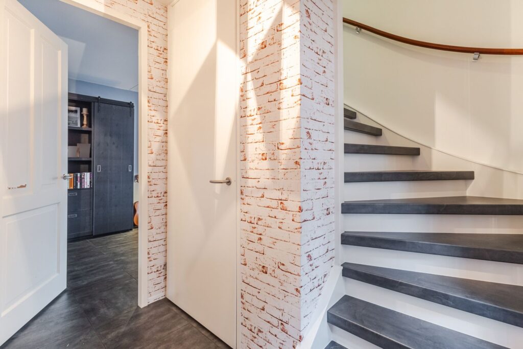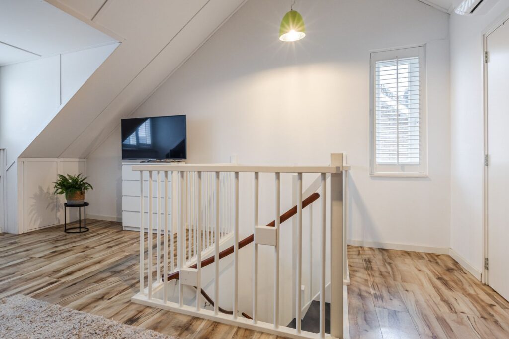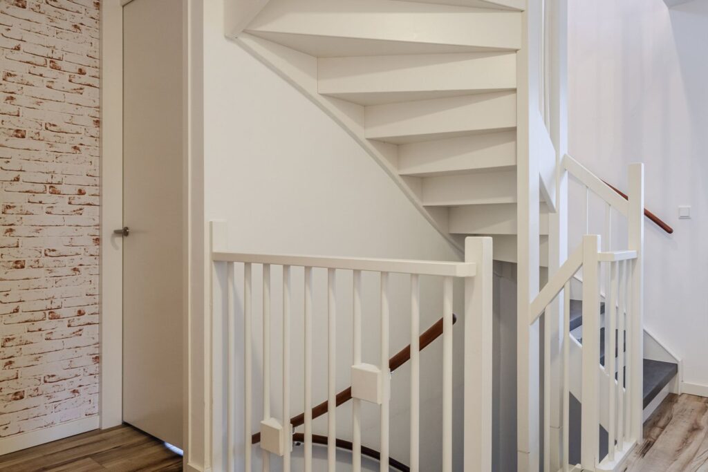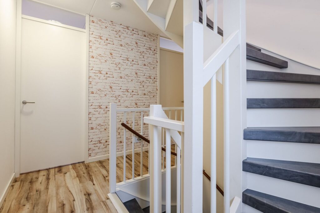 De strak met PVC afgewerkte trap en de nette, verlichte trapkast maken het geheel compleet.