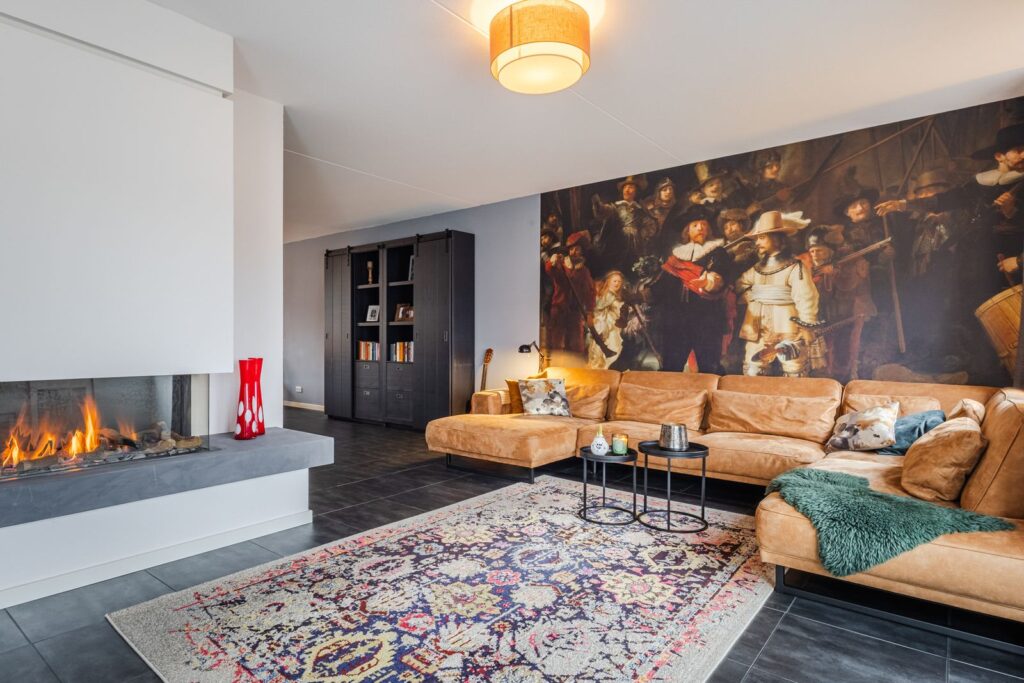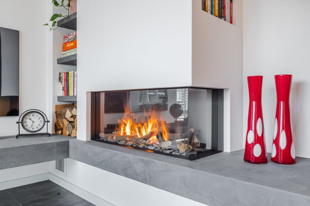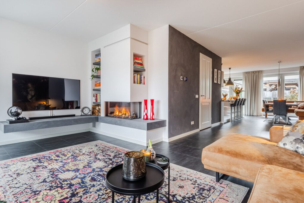In de woonkamer brengt de stijlvolle dubbelzijdige gashaard direct sfeer en warmte, eenvoudig te bedienen met een afstandsbediening.