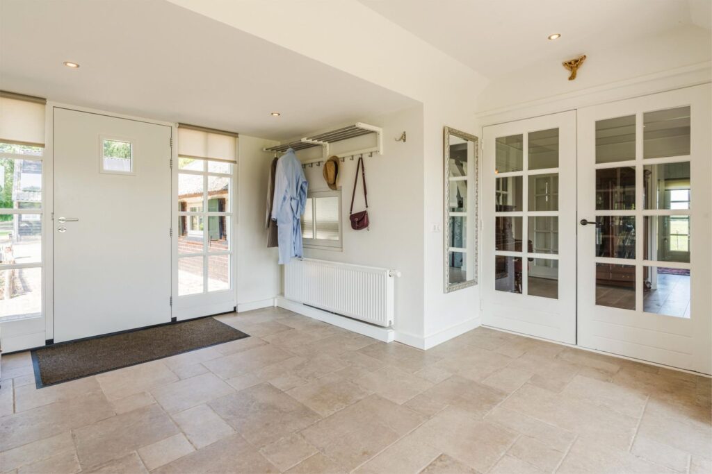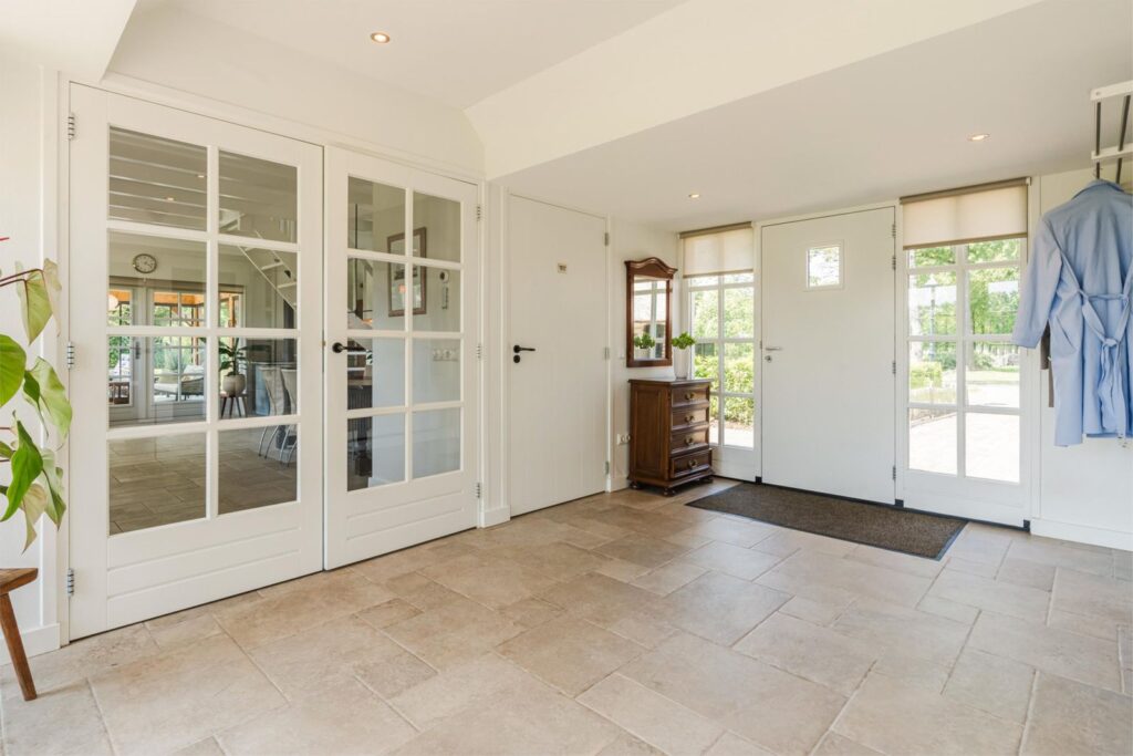 Royale en lichte centrale hal met openslaande deuren naar de achterzijde en terrassen. De hal verbind met aan weerszijde dubbele deuren, de oude boerderij met de voormalige schuur die verbouwd is tot woonkeuken. Toiletruimte met zwevend toilet met wastafel (koud en warm water).