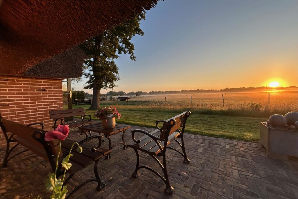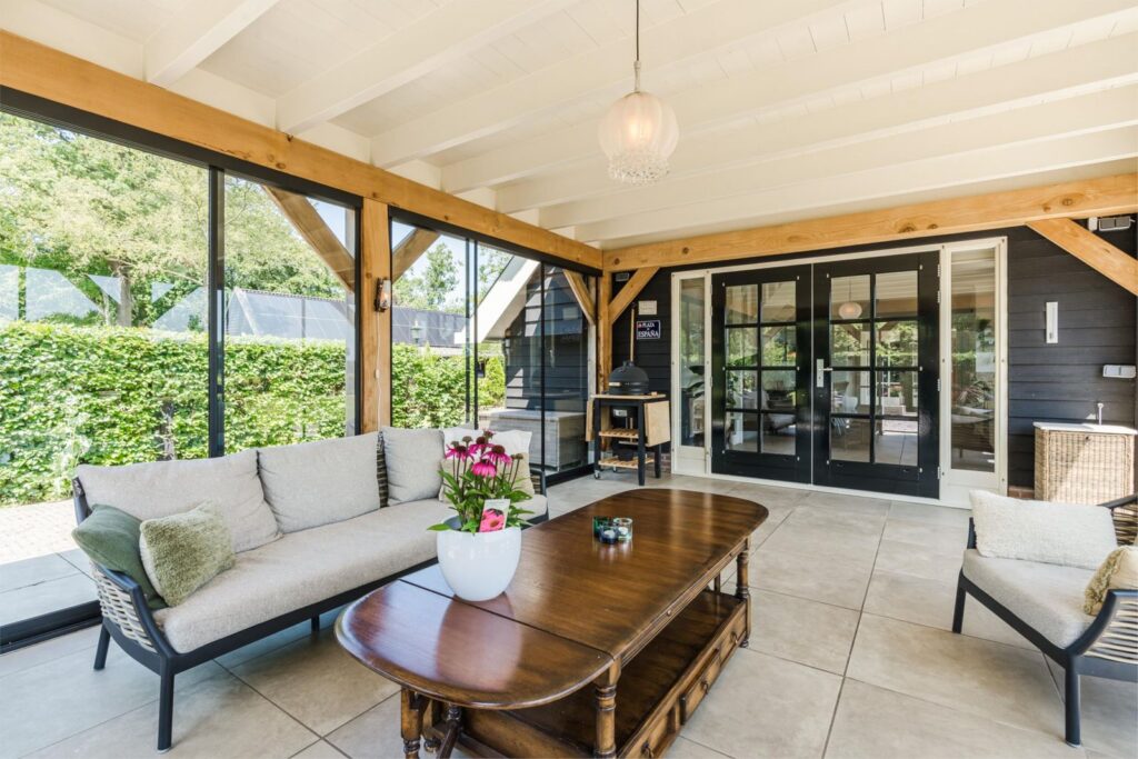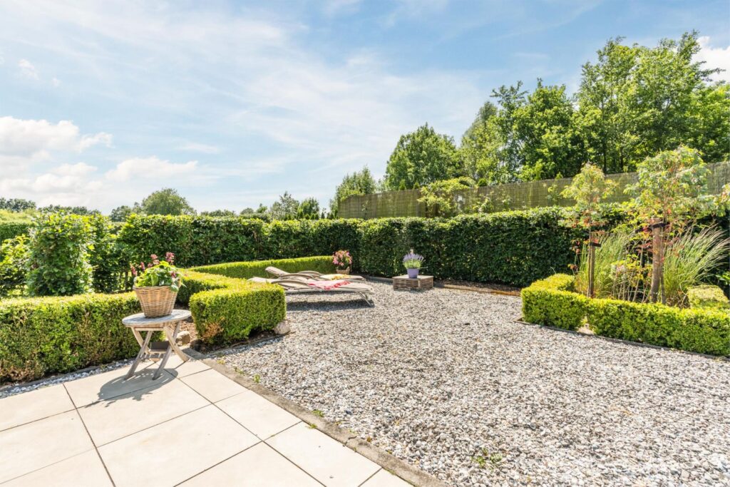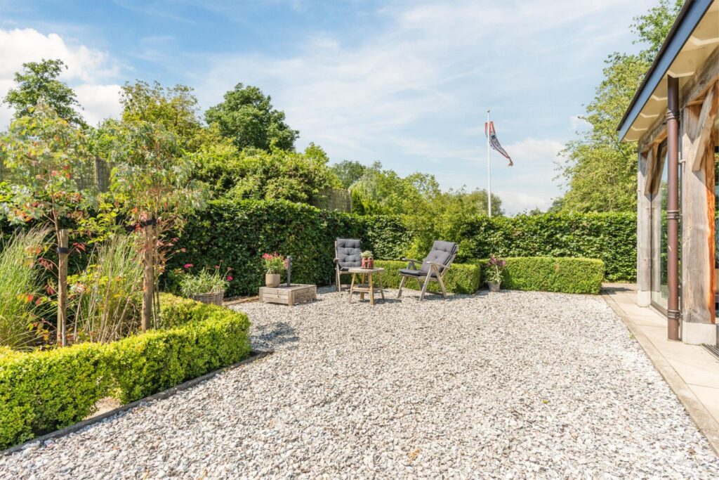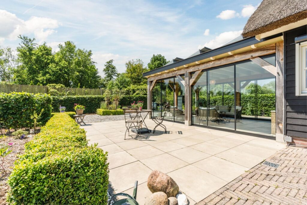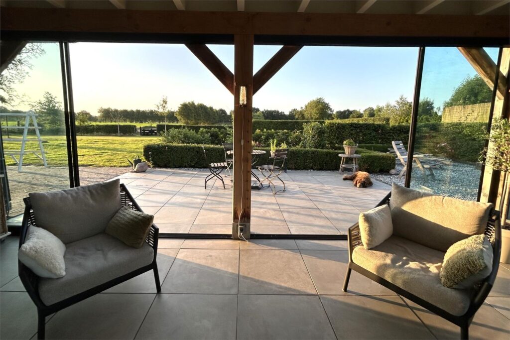 Hier beleef je het buitenleven met alle comfort, in alle seizoenen door de aanbouw van een prachtige serre (2020) met speksteen houtkachel (incl. oven) waar je zelfs in de winter tussen glazen schuifdeuren en knapperend haardvuur geniet van uitzicht op reeën, vogels en weidse luchten. Meerdere terrassen bieden altijd een plek in de zon of juist verkoelende schaduw. Of je nu ’s ochtends geniet van koffie in de serre of ’s avonds in stilte naar de sterren kijkt – hier leef je met het ritme van de natuur. Het hoofdterras, grenzend aan de serre, beschut door hagen, is op het zuiden gelegen. De onderhoudsluwe tuin is voorzien van een eigen bron en biedt volop ontwikkelmogelijkheden.