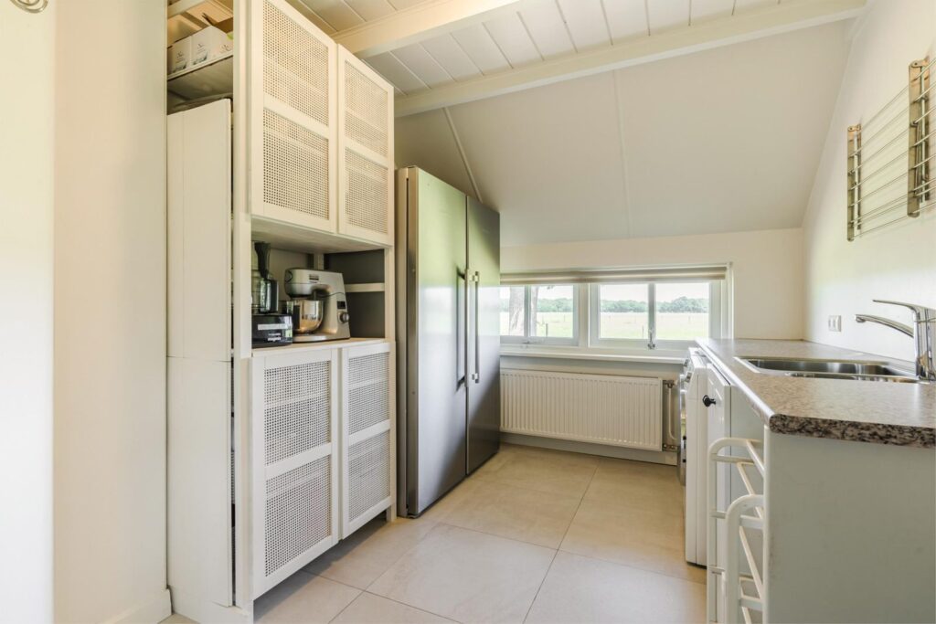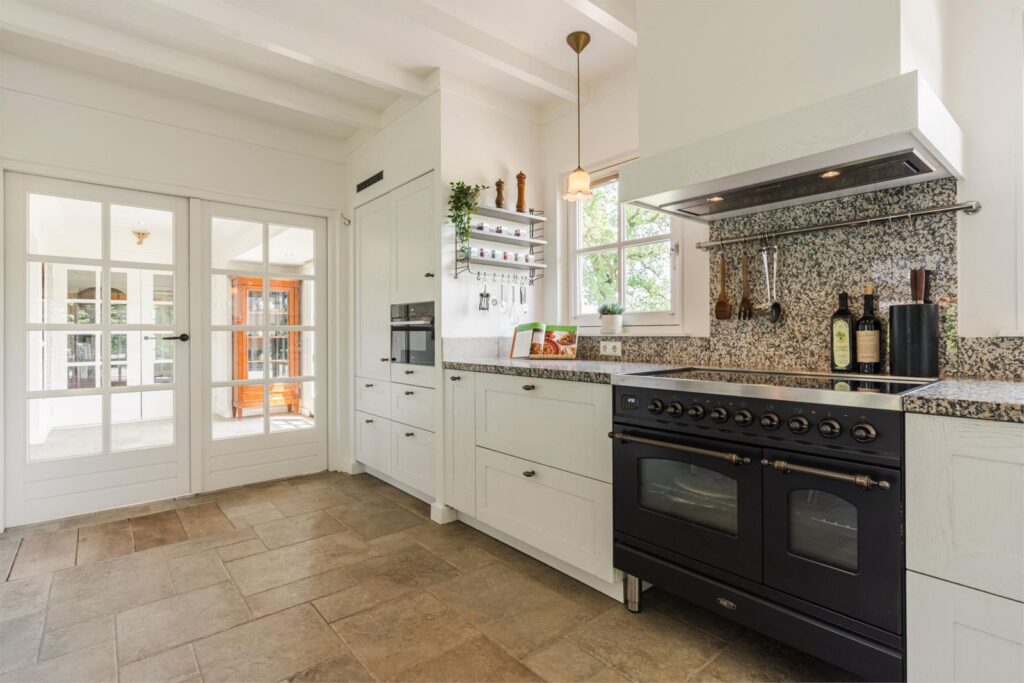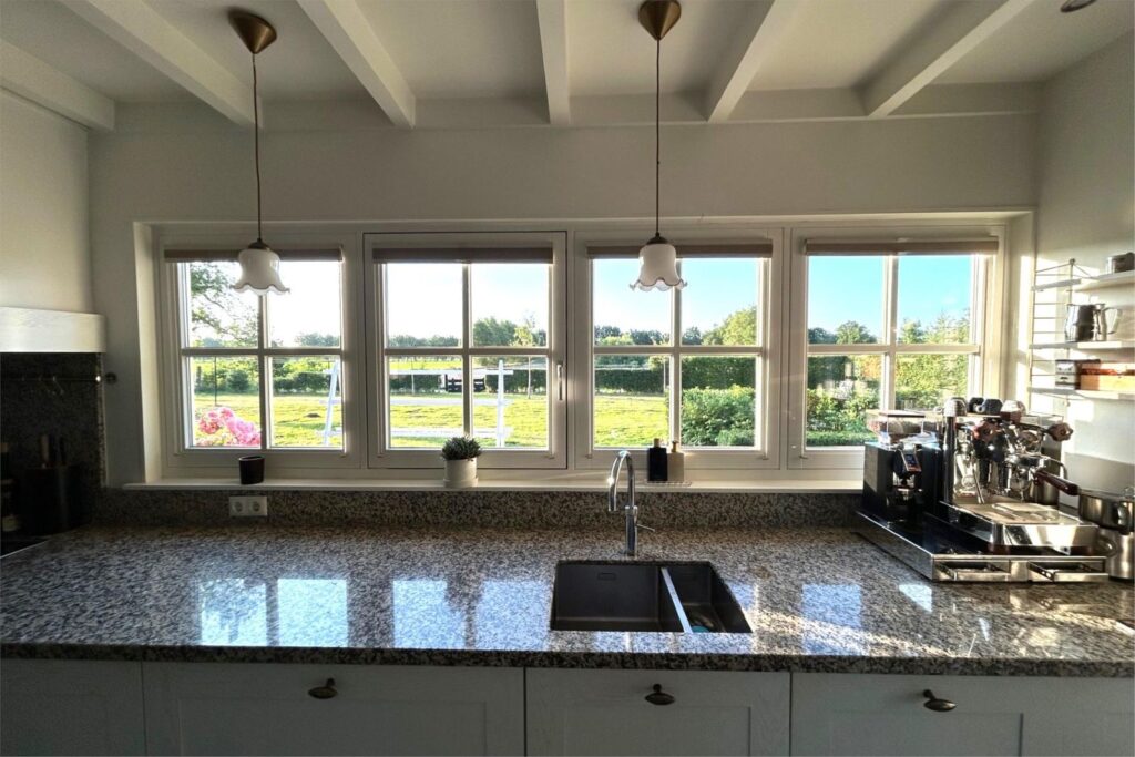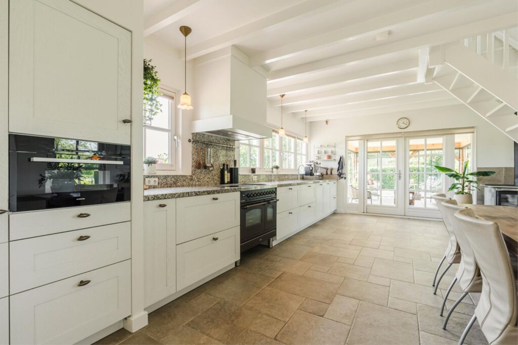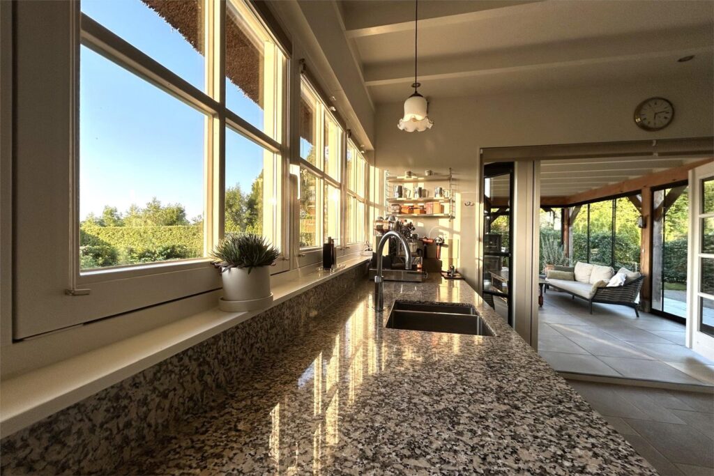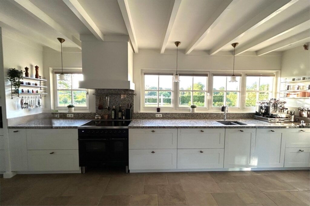 Aan de andere zijde van de entreehaal bevindt zich de zeer royale lichte landelijke woon- en leefkeuken kenmerkt zich door een lang en extra diep granieten aanrecht, Quooker, Boretti inductiefornuis én hout gestookt speksteenfornuis. Vanuit de keuken heb je een spectaculair op de tuin en de weilanden waar je niet zelden de reeën ziet grazen.