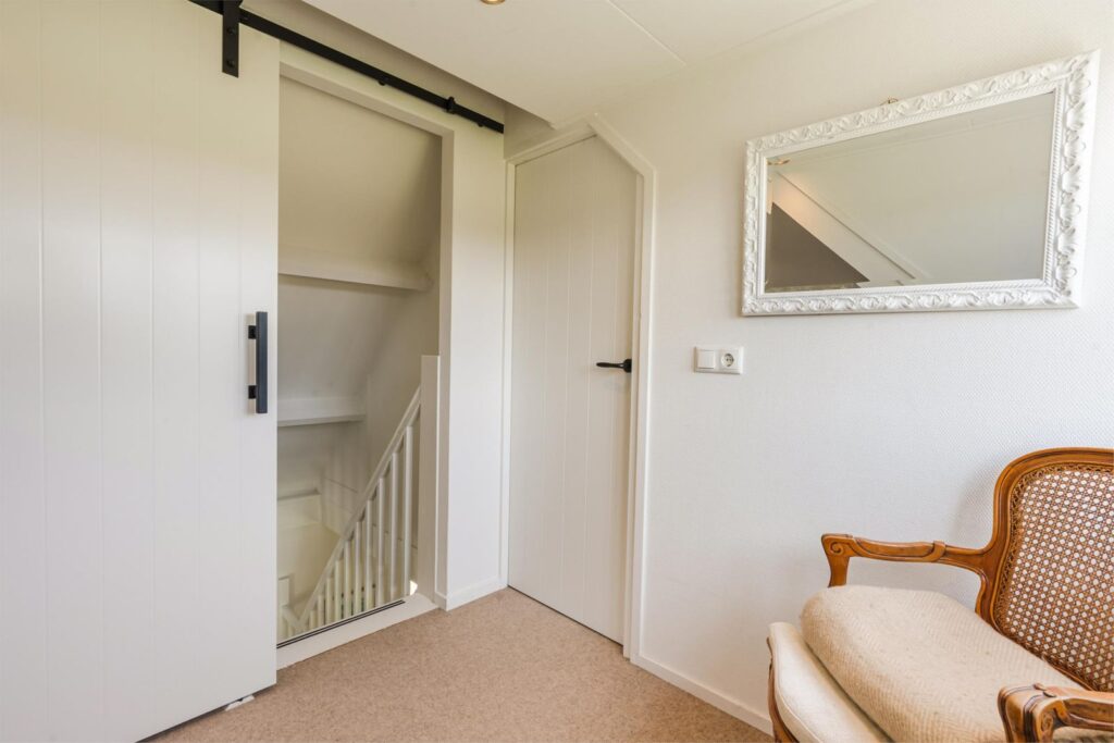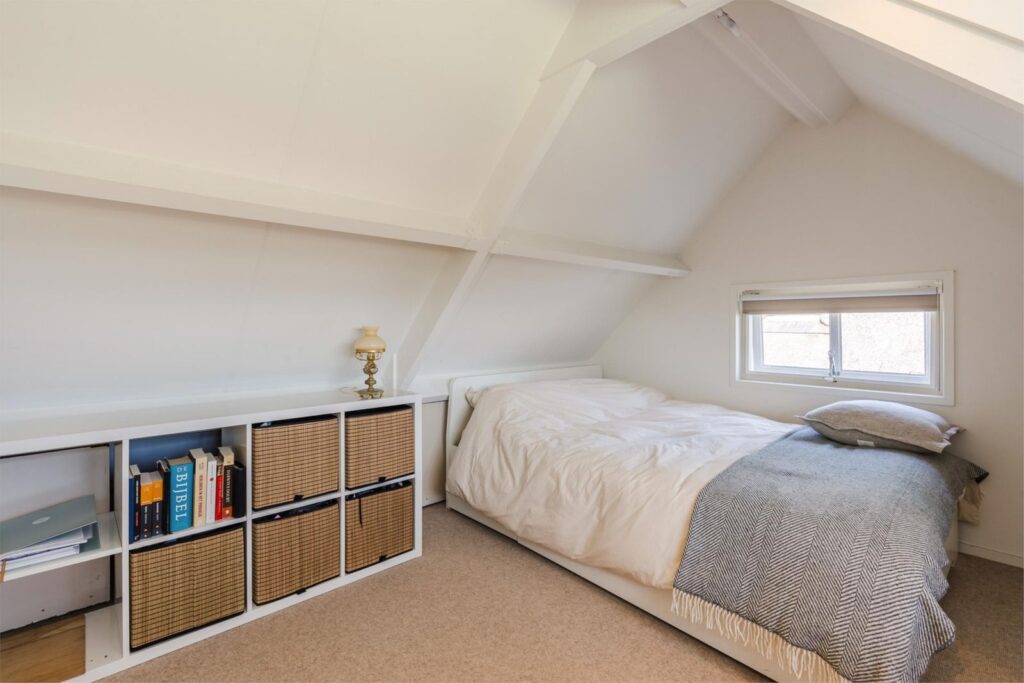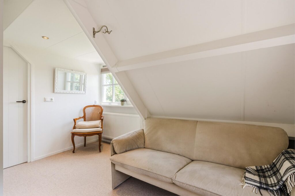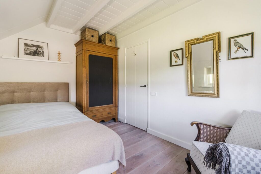 Op de eerste bovenverdieping vind je een slaapkamer met extra grote dubbele dakramen. Vanuit je bed uitzicht over de prachtige landerijen en een opkomende zon die je ’s ochtends wekt. Aangrenzend een fijne kledingruimte, oorspronkelijk en ook te gebruiken als (5e) slaapkamer. De verdieping is voorzien van (geiten)wollen vloerbedekking in lichte kleurstelling.