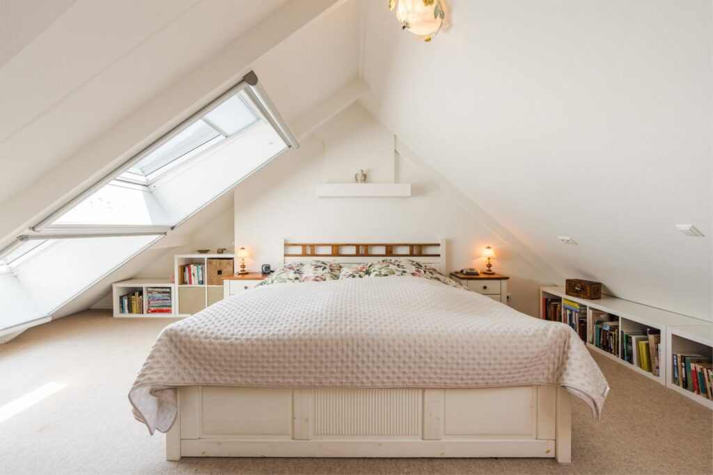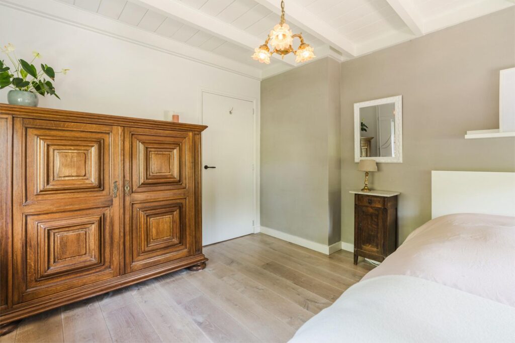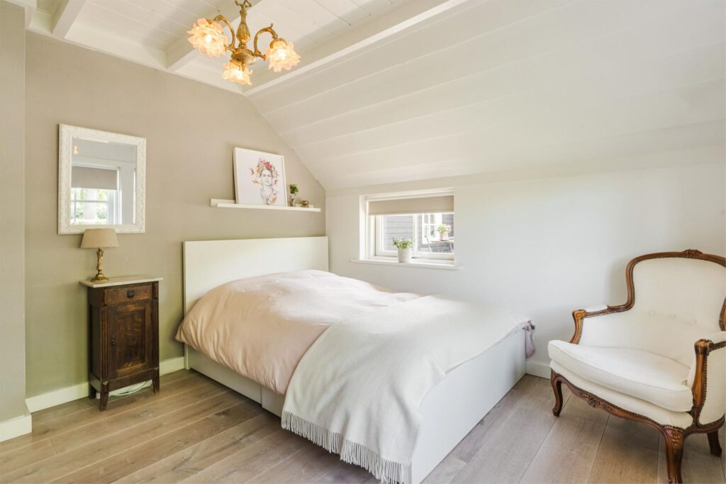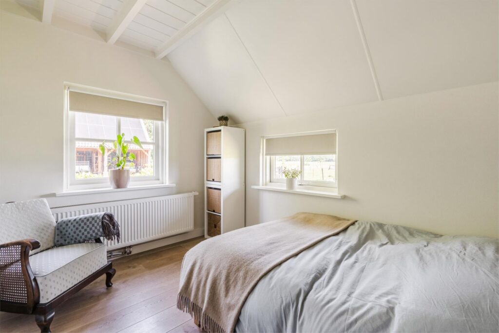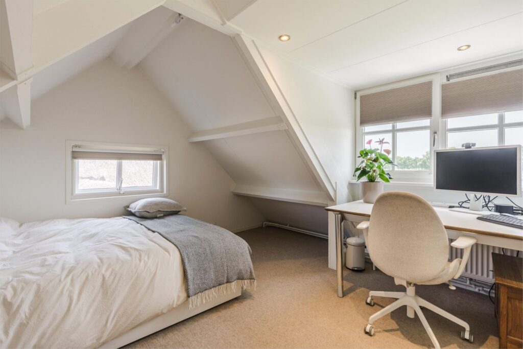 Op de eerste bovenverdieping vind je een slaapkamer met extra grote dubbele dakramen. Vanuit je bed uitzicht over de prachtige landerijen en een opkomende zon die je ’s ochtends wekt. Aangrenzend een fijne kledingruimte, oorspronkelijk en ook te gebruiken als (5e) slaapkamer. De verdieping is voorzien van (geiten)wollen vloerbedekking in lichte kleurstelling.