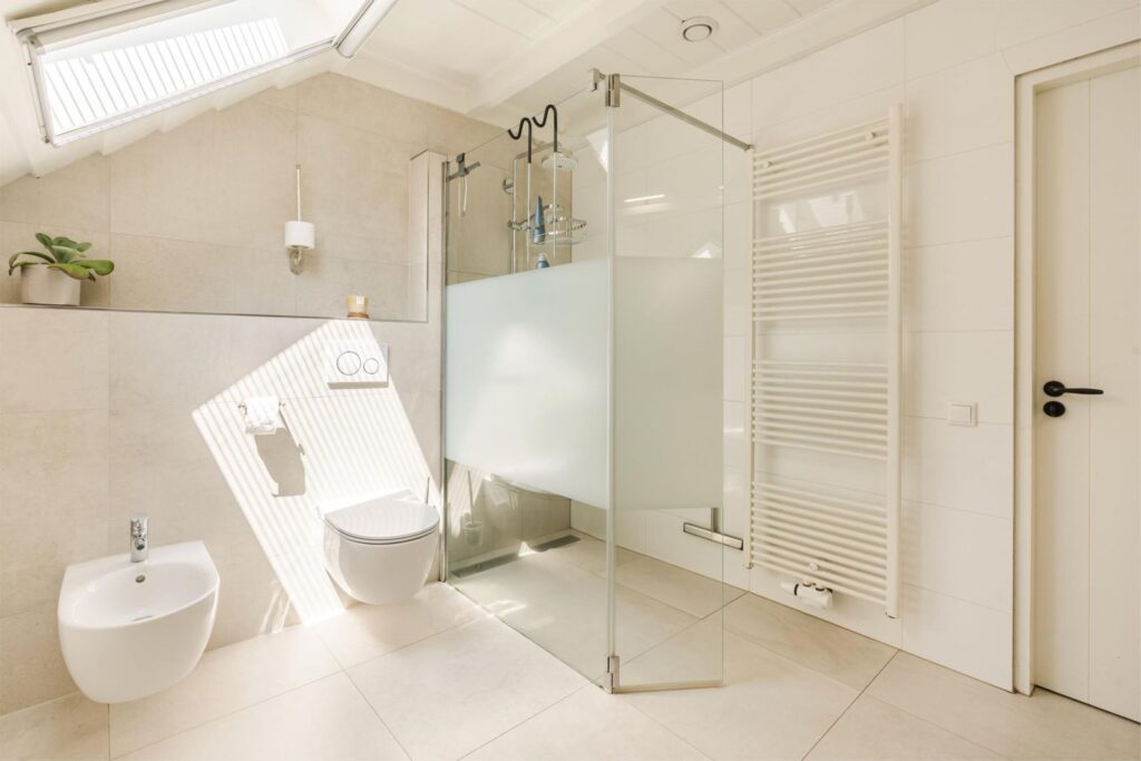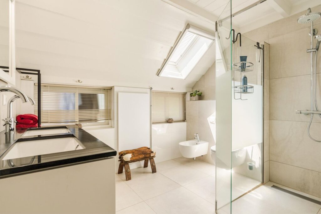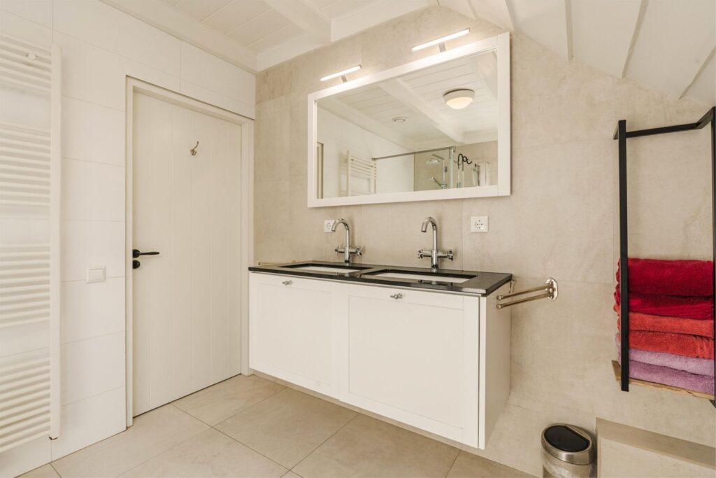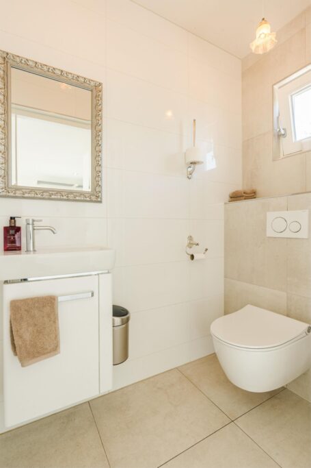 Via dubbele deuren is de woonkamer verbonden met de gang waaraan twee slaapkamers, badkamer en bijkeuken zijn gelegen. Badkamer in lichte kleurstelling op de begane grond met vloerverwarming, ruime inloopdouche, zwevend toilet, dubbele wastafel, en bidet. Tegenover badkamer ligt (in dezelfde kleurstelling) de bijkeuken met aanrechtblad spoelbak, wasmachineaansluiting en mogelijkheden voor voorraden en opslag. Tot slot aan het einde van de gang, twee sfeervolle slaapkamers met eikenhouten vloeren.