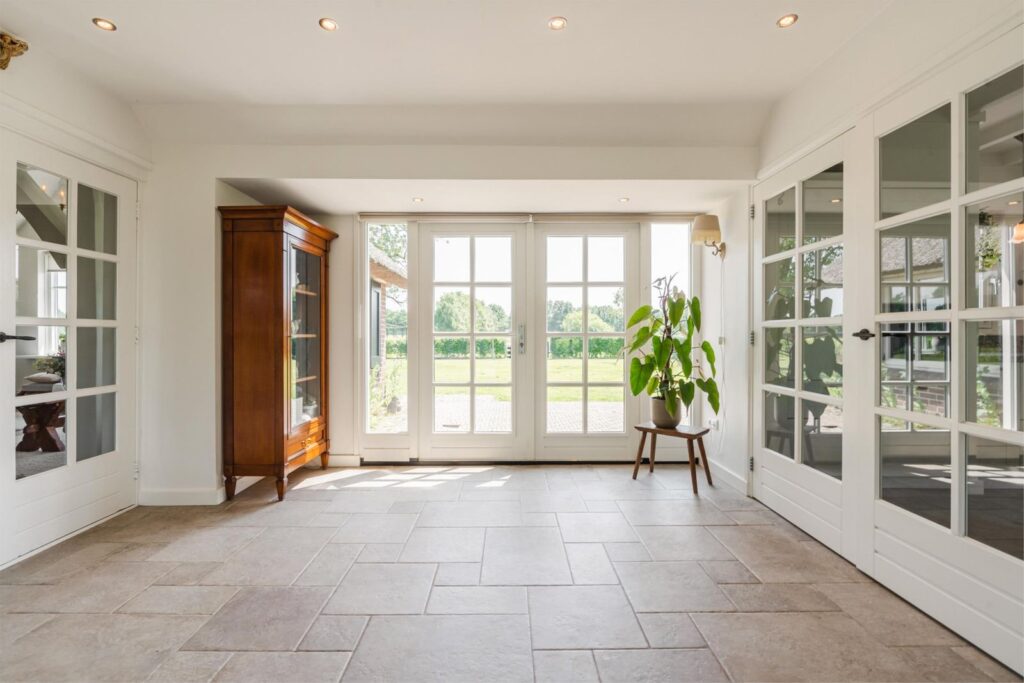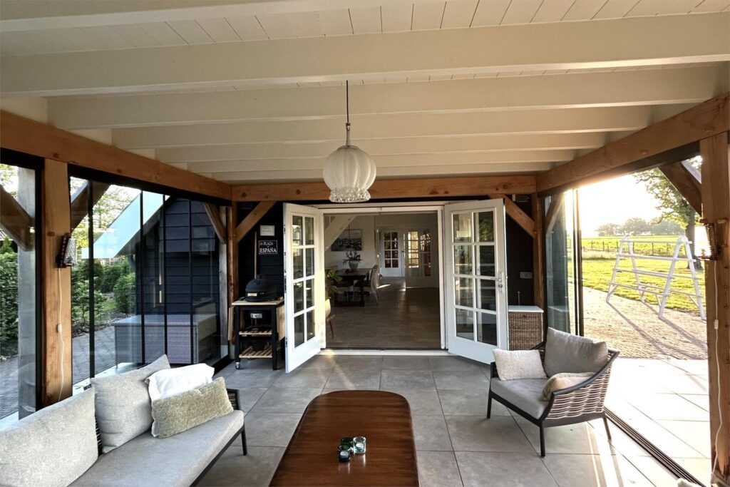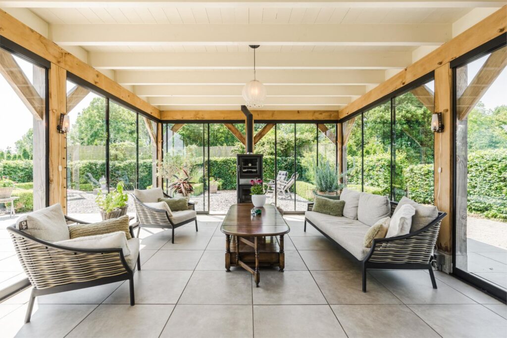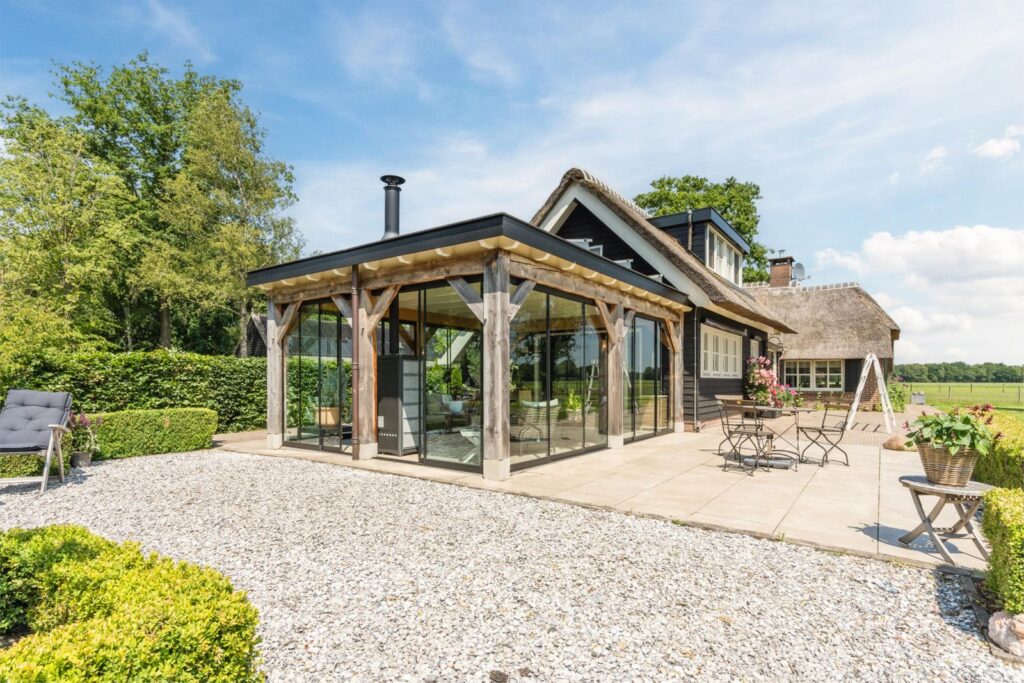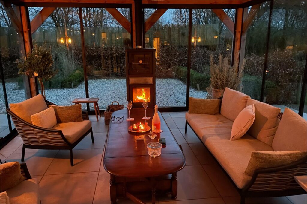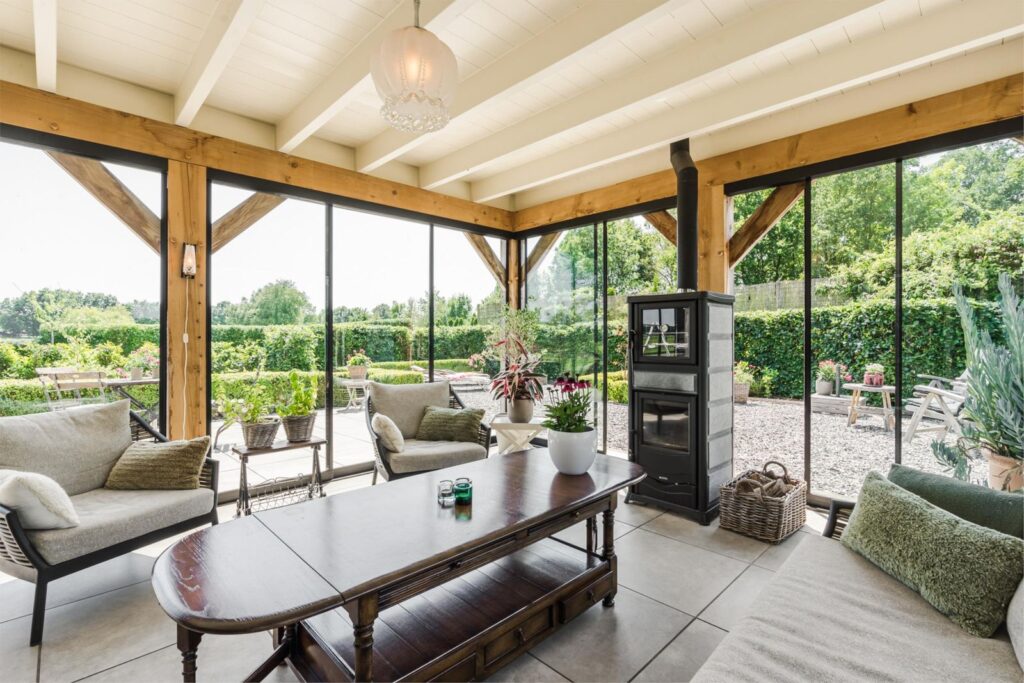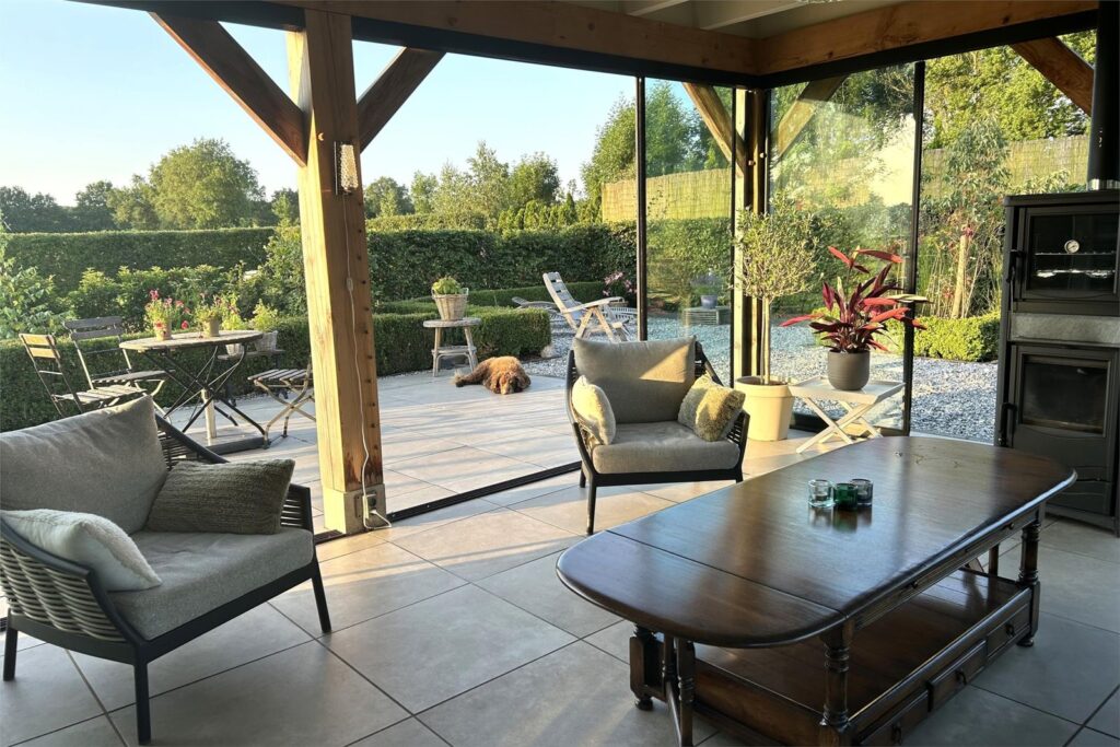 Via de openslaande deuren in de keuken bereik je een prachtige en ruime serre met schuifdeuren rondom en houtkachel met oven, waardoor je hier alle seizoenen kunt verblijven.