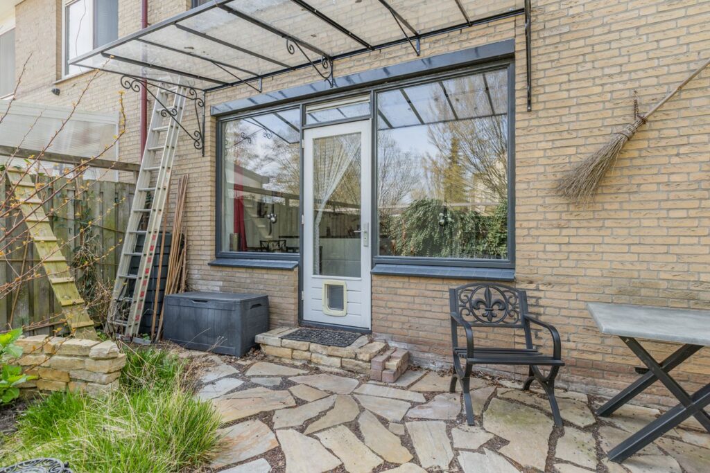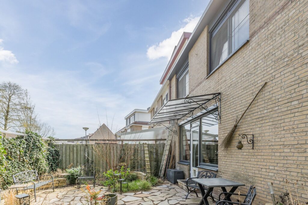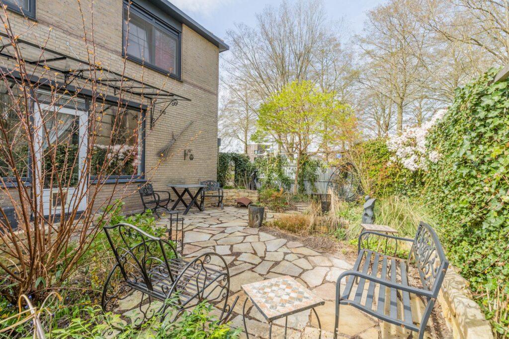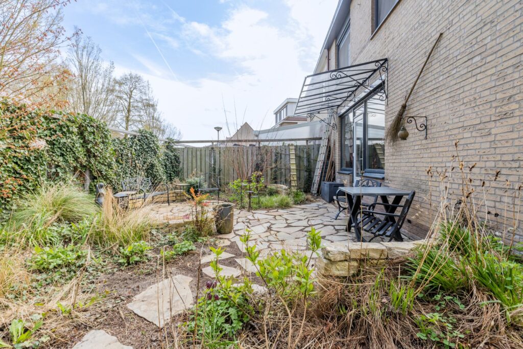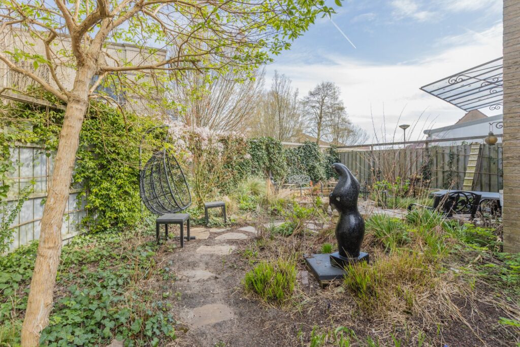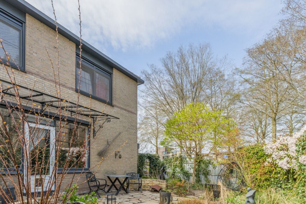 De zonnige tuin rondom de woning biedt veel privacy en ruimte om te ontspannen, te spelen of te tuinieren. De hoekligging zorgt voor een vrij gevoel en extra buitenruimte. De tuin ligt noordoost, dus in hete zomers is het relatief koel in huis en kun je altijd kiezen voor een zitplekje in de zon of schaduw.
