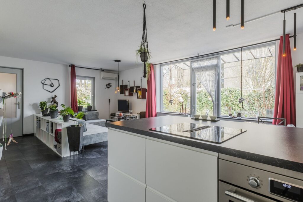 Entree met hal, verdeler van de vloerverwarming, meterkast met 3-fasen aansluiting en toegang tot de woonkamer. De lichte woonkamer heeft dankzij de hoekligging extra veel lichtinval en biedt een prettig uitzicht op de tuin. De trapopgang bevindt zich in de woonkamer, wat zorgt voor een open en praktische indeling. De open keuken (2024) is voorzien van een praktisch kookeiland, voorzien van een inductie kookplaat met ingebouwde afzuiging en vaatwasser aansluiting, biedt voldoende werk- en opbergruimte. De gehele begane grond is uitgerust met vloerverwarming en een nette laminaatvloer. Alle ramen zijn HR++ glas.