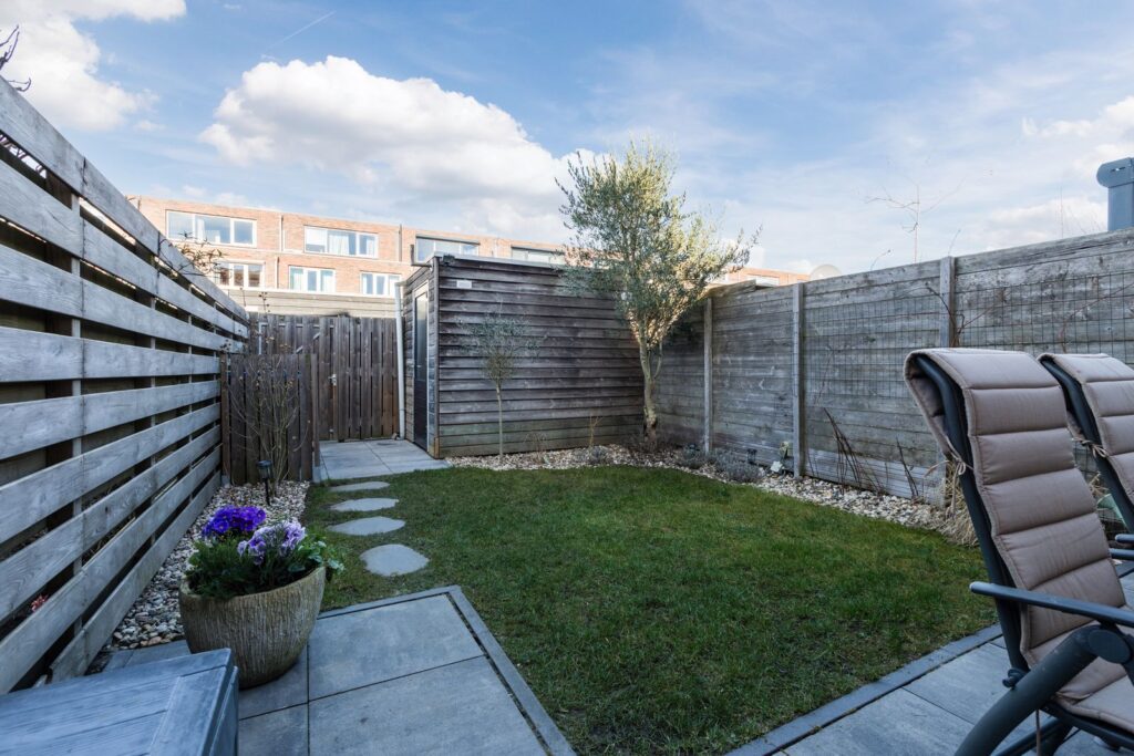 Buiten: De zonnige achtertuin is ruim en deels betegeld (de tegels zijn recent vernieuwd) en heeft een vrijstaande berging.