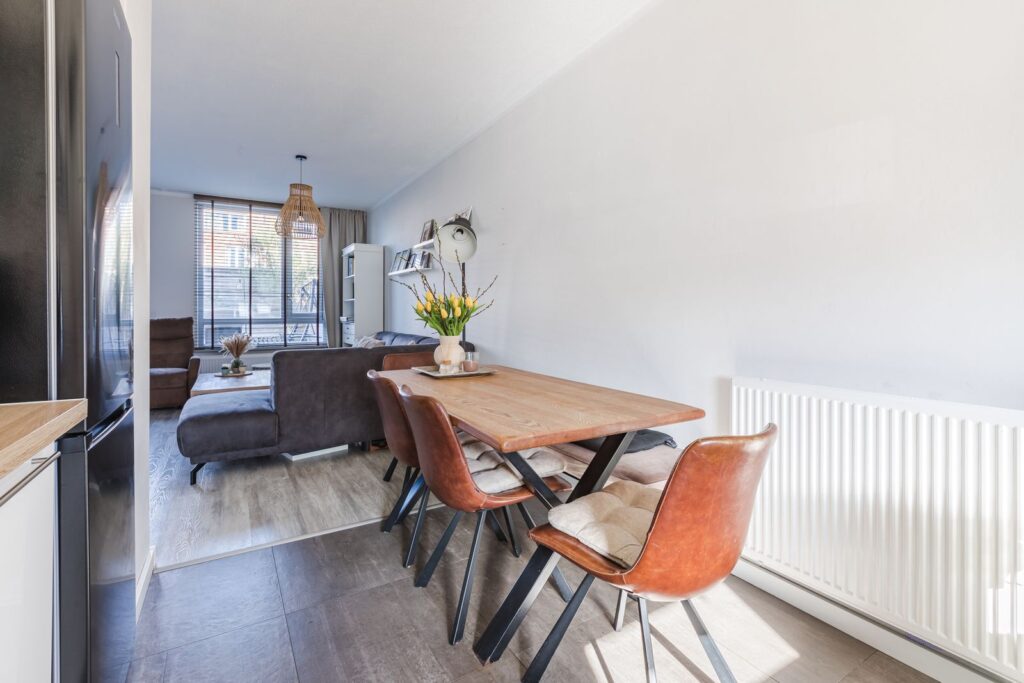 Begane grond: Entree in hal met meterkast, vernieuwde toiletruimte (2023) voorzien van een hangend toilet en fonteintje, en trapopgang. De woonkamer heeft aan de voorzijde een moderne open keuken met diverse inbouwapparatuur, waaronder een inductiekookplaat, koelkast, vriezer, oven en vaatwasser. De tuingerichte woonkamer beschikt over een vaste kast en een deur naar de achtertuin. De woonkamer is voorzien van een laminaatvloer, terwijl de keuken is afgewerkt met plavuizen.