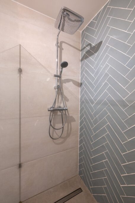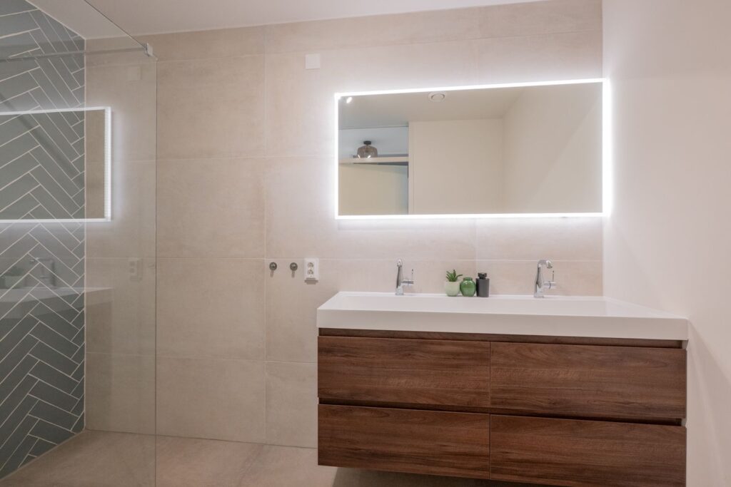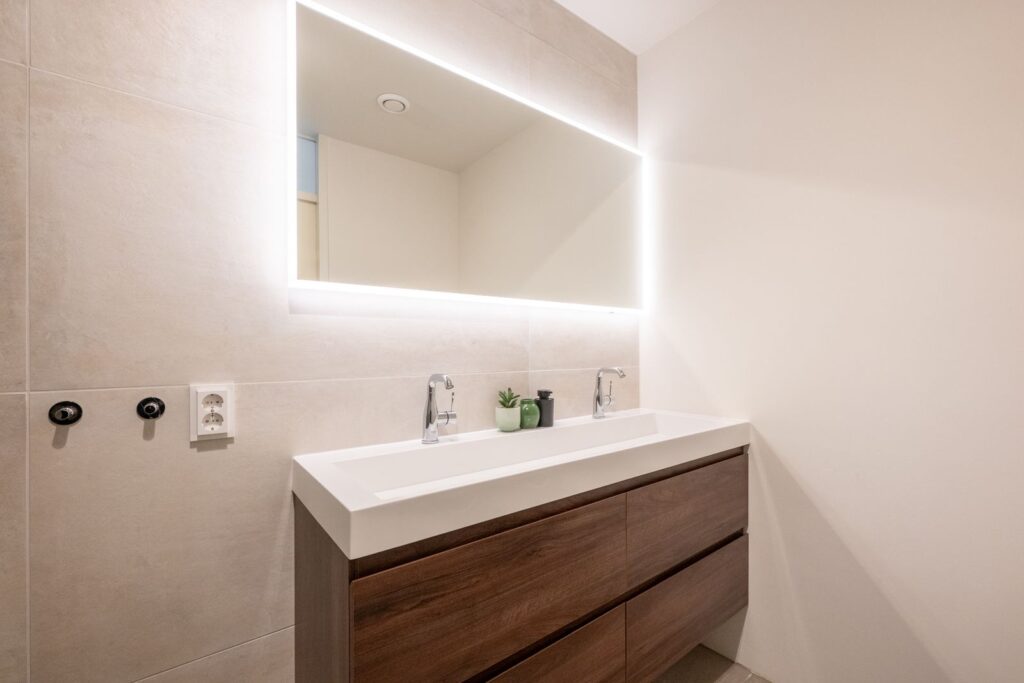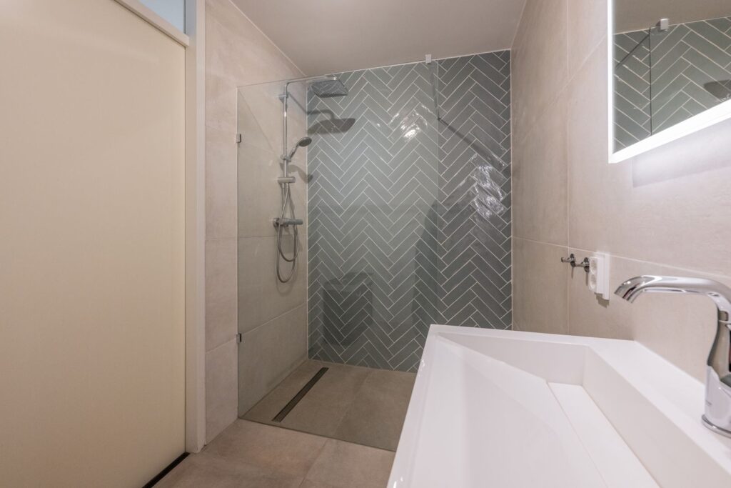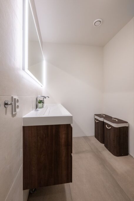 Centraal in de woning bevindt zich de moderne badkamer. Deze is uitgevoerd met grote zandkleurige wand- en vloertegels, voorzien van een ruime inloopdouche met glazen wand, een dubbel wastafelmeubel met lades en verwarmde spiegel. Daarnaast is er een separaat toilet en een praktische wasruimte/berging met aansluiting voor de wasmachine en extra opbergruimte.
