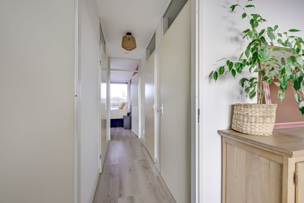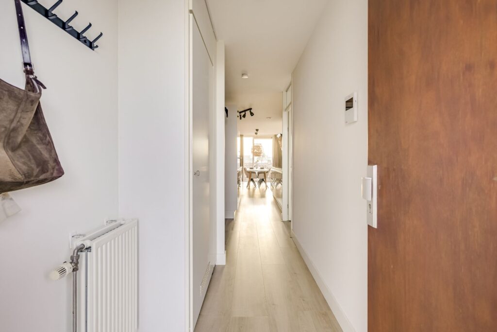 Via the gallery, you reach the apartment’s front door. You enter the hallway with a meter cupboard and access to the various rooms.