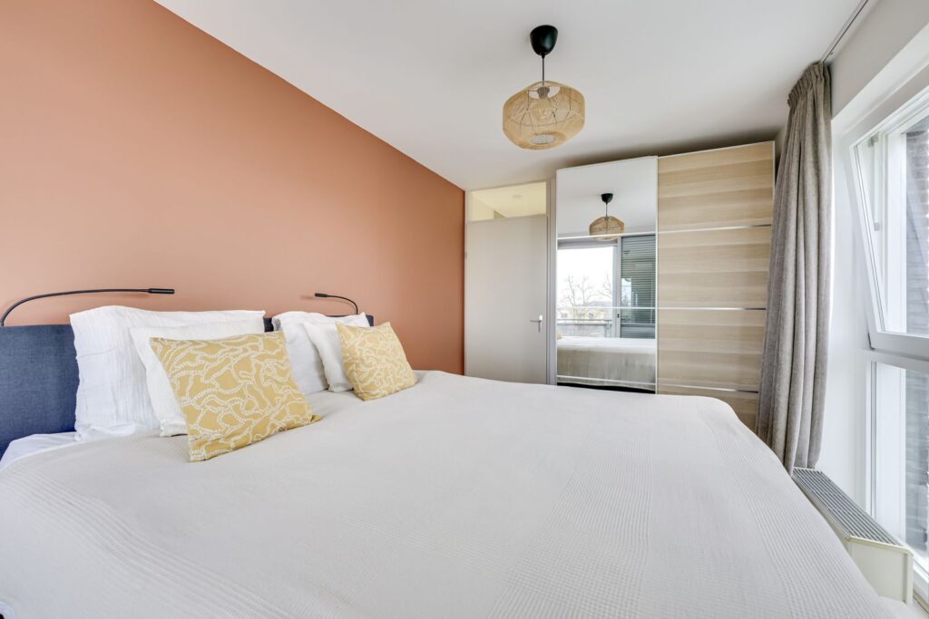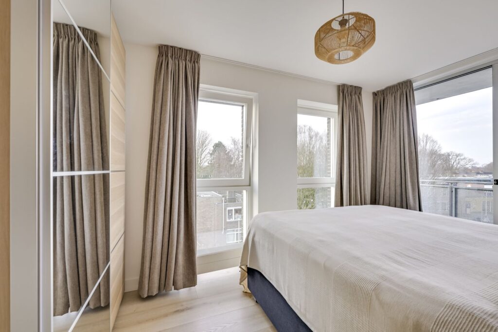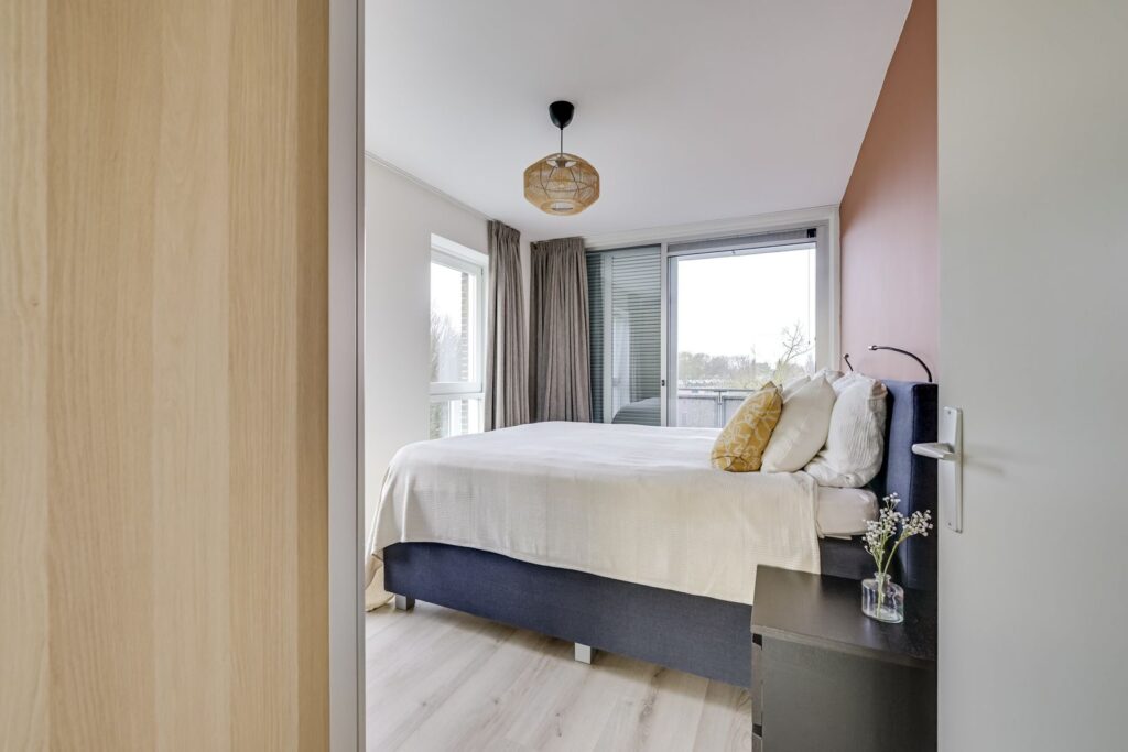 Aan de voorzijde van het appartement liggen beide slaapkamers. De kamers zijn nagenoeg even groot en beide ruim genoeg voor een tweepersoonsbed en een kledingkast. Eén slaapkamer bereik je via de hal naast de woonkamer, de andere ligt bij de voordeur. Dankzij de brede ramen zijn beide kamers heerlijk licht. Ideaal als hoofdslaapkamer, kinderkamer, thuiswerkplek of logeerkamer.