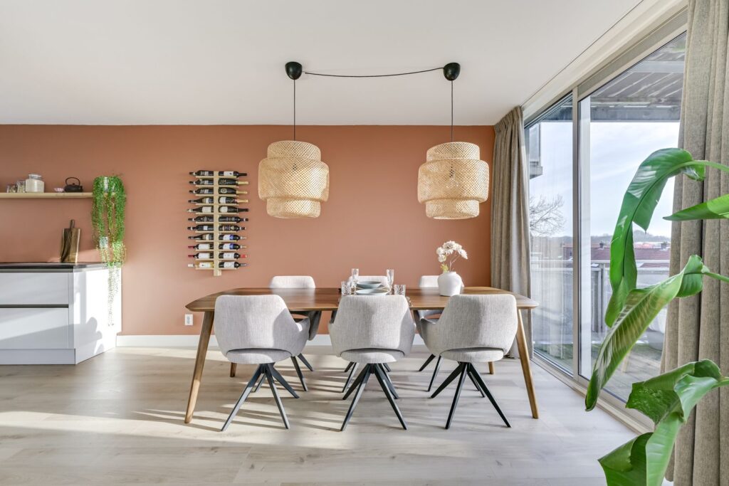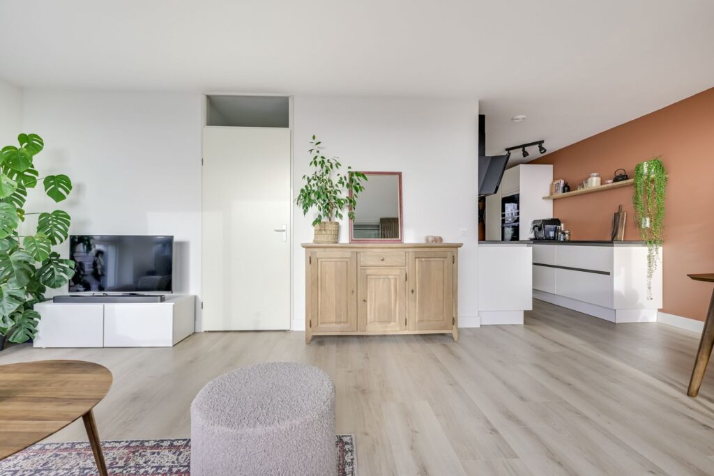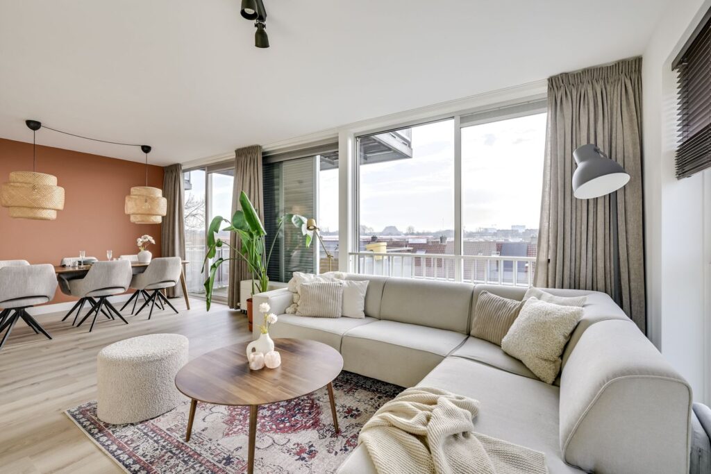 At the rear of the apartment is the spacious living room with open kitchen. What immediately stands out is the abundance of natural light, thanks to the large sliding doors to the balcony and the many windows. There is more than enough space for a comfortable seating area as well as a dining table for hosting friends.
