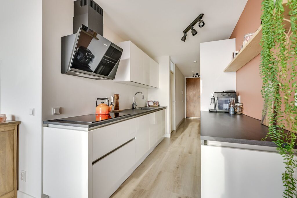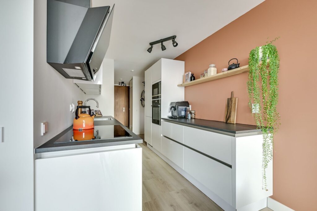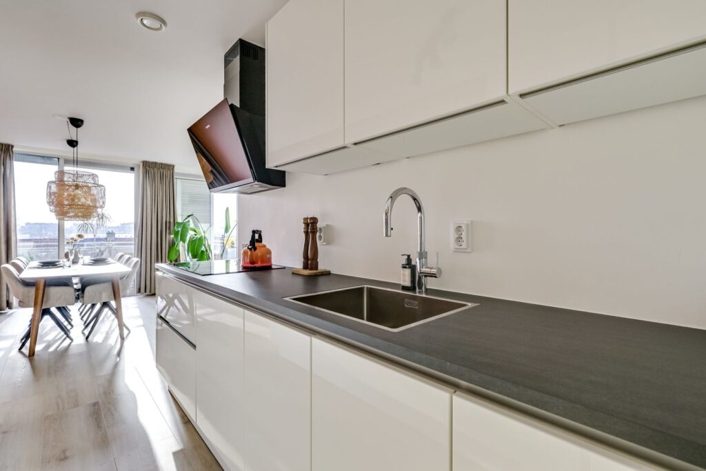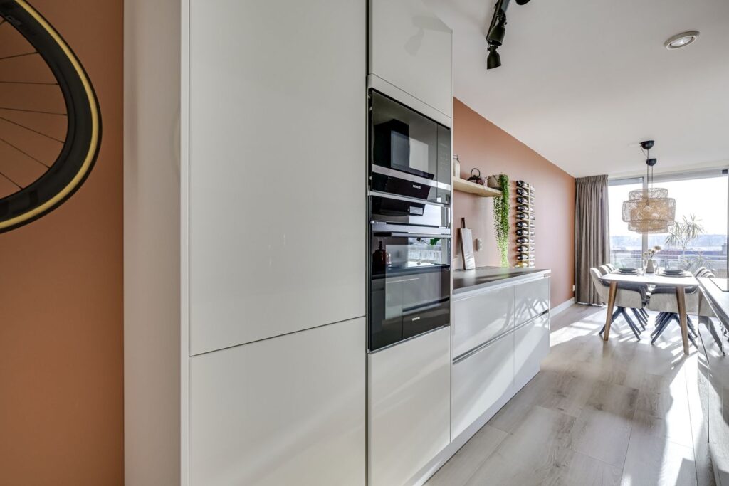 Via de galerij bereik je de voordeur van het appartement. Je komt binnen in de hal met meterkast en toegang tot de verschillende vertrekken. Aan de achterzijde ligt de ruime woonkamer met open keuken. Wat direct opvalt is het licht, dankzij de grote schuifpui naar het balkon en de vele ramen. Er is meer dan genoeg plek voor een comfortabele zithoek én een eettafel om uitgebreid te tafelen met vrienden. De open keuken is uitgevoerd in een tijdloze witte opstelling met een donker werkblad en beschikt over diverse inbouwapparatuur, waaronder een inductiekookplaat, afzuigkap, magnetron, oven, koel-vriescombinatie, vaatwasser en een Quooker. Veel kastruimte en een praktische indeling maken dit een fijne plek om te koken. Vanuit de woonkamer stap je via de schuifpui zo het balkon op. Hier zit je heerlijk vrij met een weids uitzicht over het groen en de stad. Door de ligging op het zuidwesten geniet je hier volop van de middagzon. Dankzij de hoogte ervaar je veel privacy en rust, een echt penthousegevoel.
