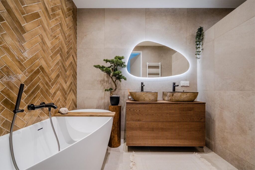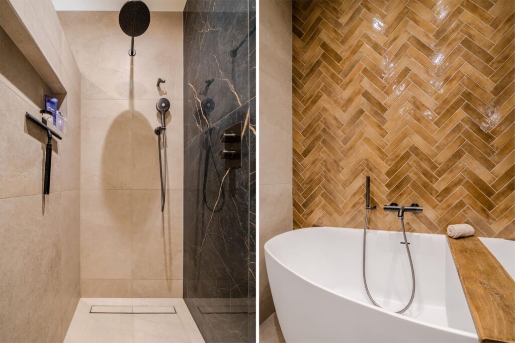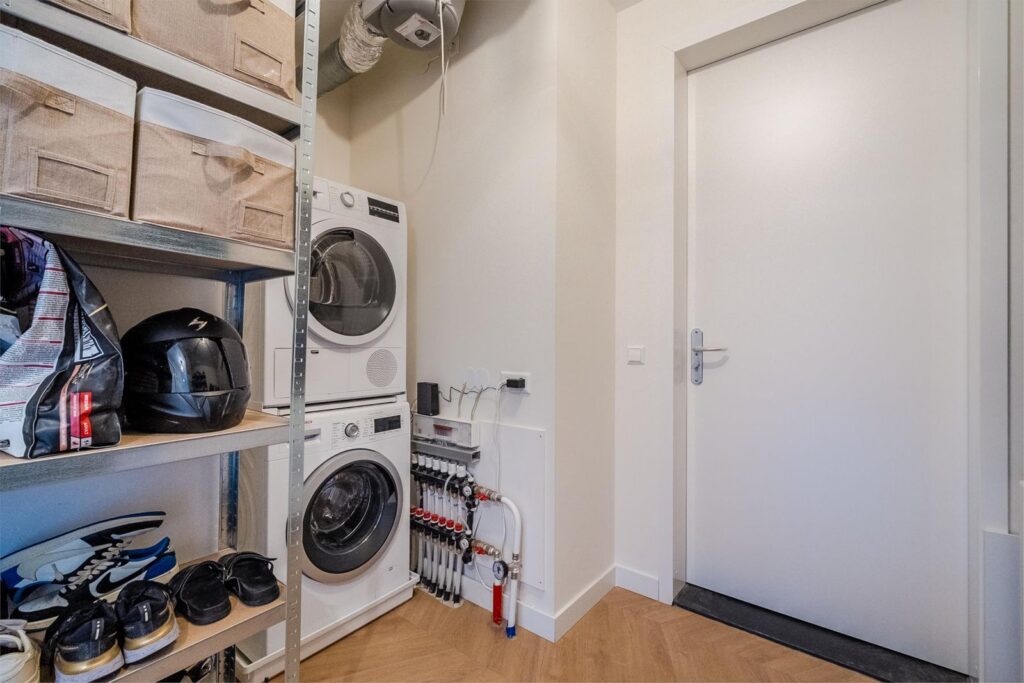 Het appartement beschikt over twee ruime slaapkamers, waaronder een master bedroom met royale inloopkast. De luxe badkamer is uitgerust met een comfortabel bad, een stijlvolle wastafel met anti-condens spiegel met dimlicht, en een inloopdouche met handdouche en nis. Er is een aparte toiletruimte en een ruime berging met aansluitingen voor wasmachine en droger.