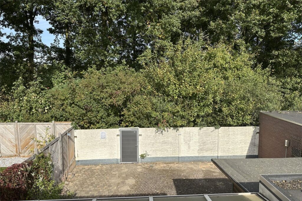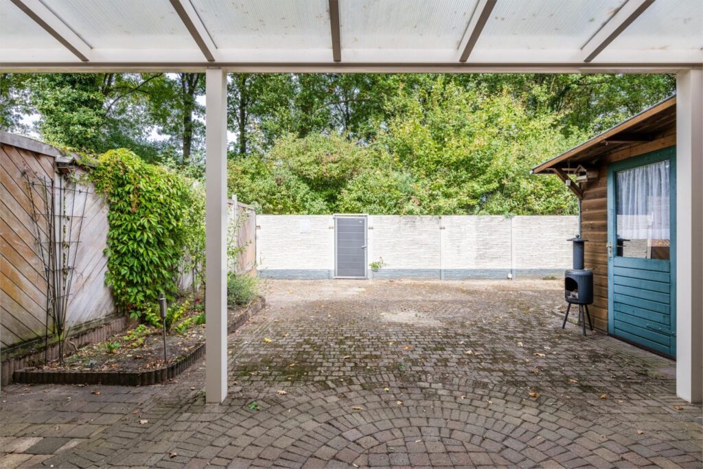 De woning beschikt over een ruime brede achtertuin (9 meter breed) die veel privacy biedt. Dankzij het vrije uitzicht aan de achterzijde kunt u hier optimaal genieten van rust en natuur. De tuin is onderhoudsvriendelijk aangelegd en biedt voldoende ruimte voor een terras, speelplek of moestuin. Aan de voorzijde is er een eigen oprit en toegang tot de carport, ideaal voor het parkeren van uw auto of het opslaan van fietsen.