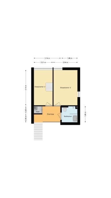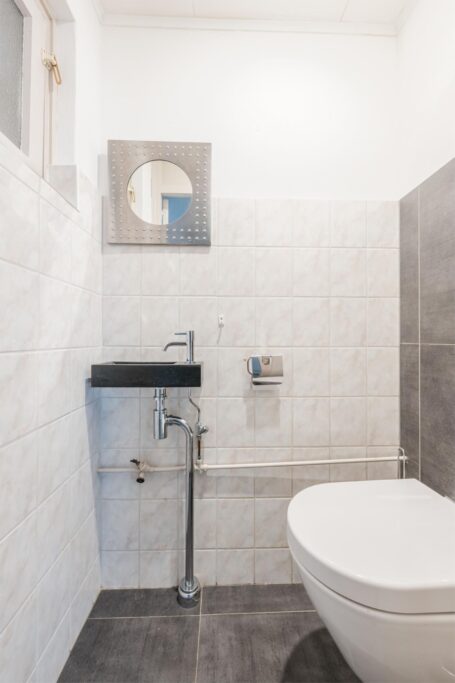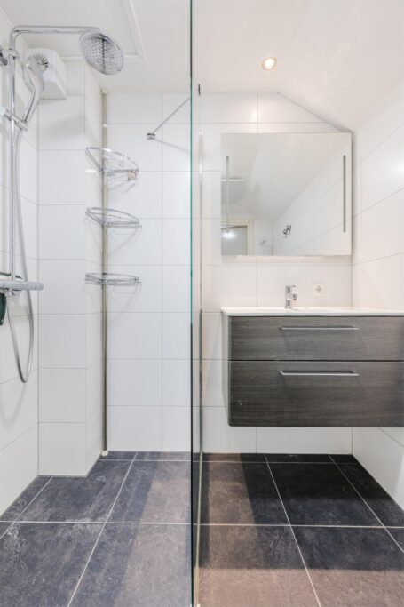 De trapopgang in de woonkamer brengt je naar de vide en overloop. Op de eerste verdieping bevinden zich 2 ruime slaapkamers, allen voorzien van grote ramen en veel lichtinval. De kamers zijn goed in te delen als master bedroom, kinderkamer of thuiswerkplek. De moderne badkamer is compleet uitgerust met douche, wastafel en tweede toilet. Ook treft je hier de cv-installatie en extra bergruimte.