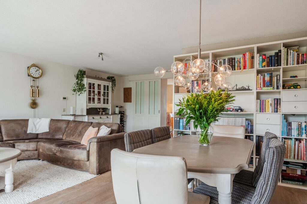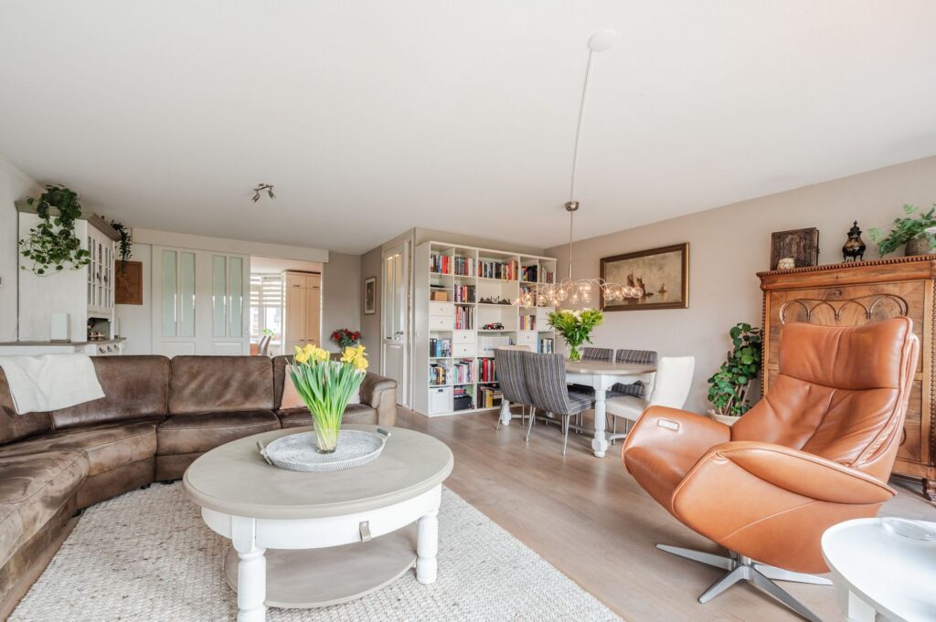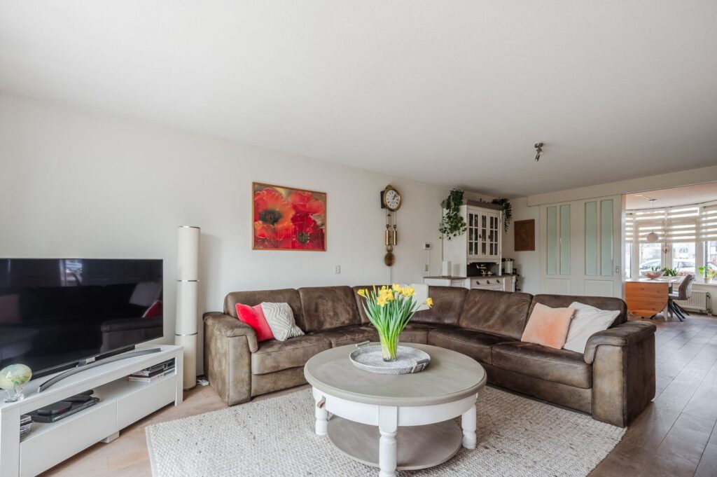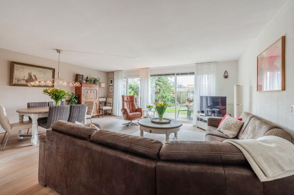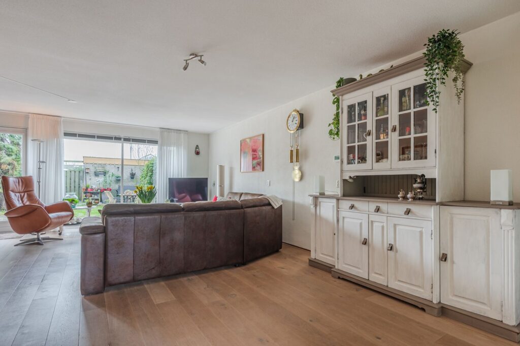 Vanuit de gang kom je in de ruime living die tuingericht is met grote raampartijen voor de nodige lichtinval wat het huis een zonnig karakter geeft.