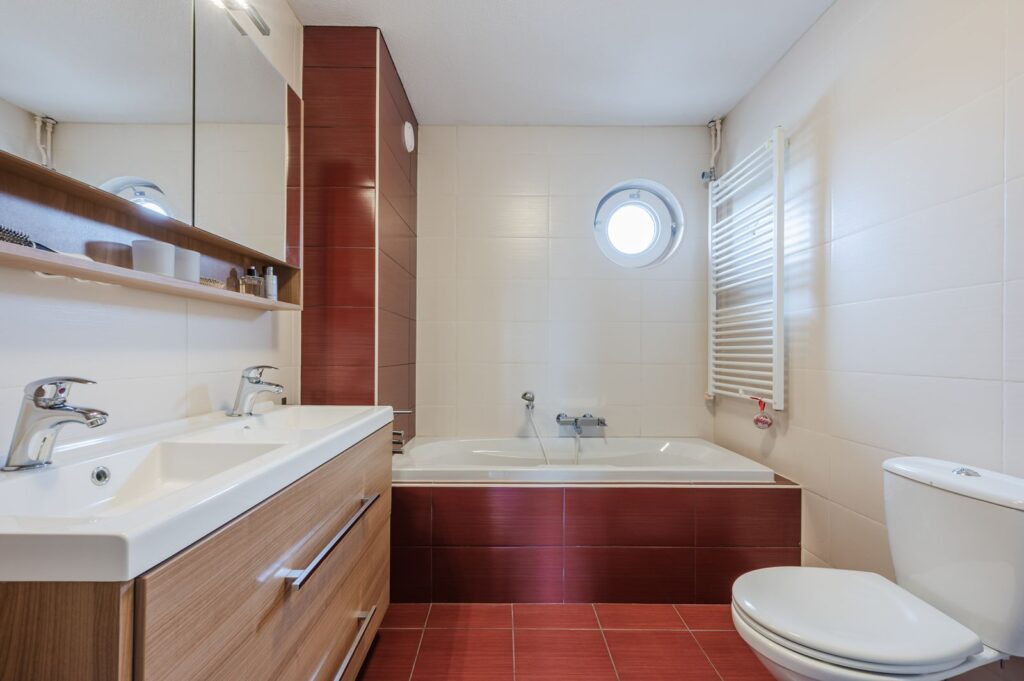 De badkamer is uitgerust met een badmeubel met dubbele wastafel, een ligbad en een aparte douche en een toilet.