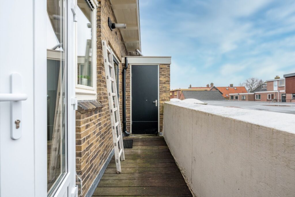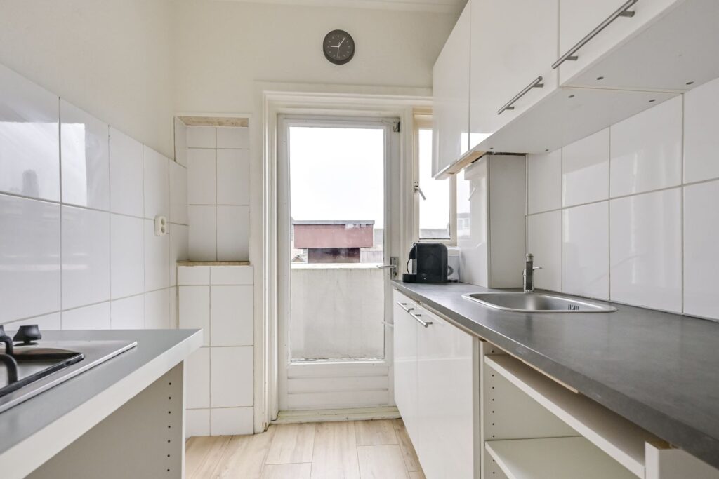 Aan de achterzijde bevindt zich de dichte keuken. Deze is eenvoudig uitgevoerd met witte kasten, een donker werkblad en een gaskookplaat. Vanuit de keuken stap je zo het balkon op. De keuken is netjes en functioneel, maar biedt ook volop mogelijkheden om hier jouw eigen droomkeuken te realiseren.
