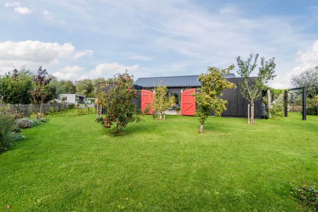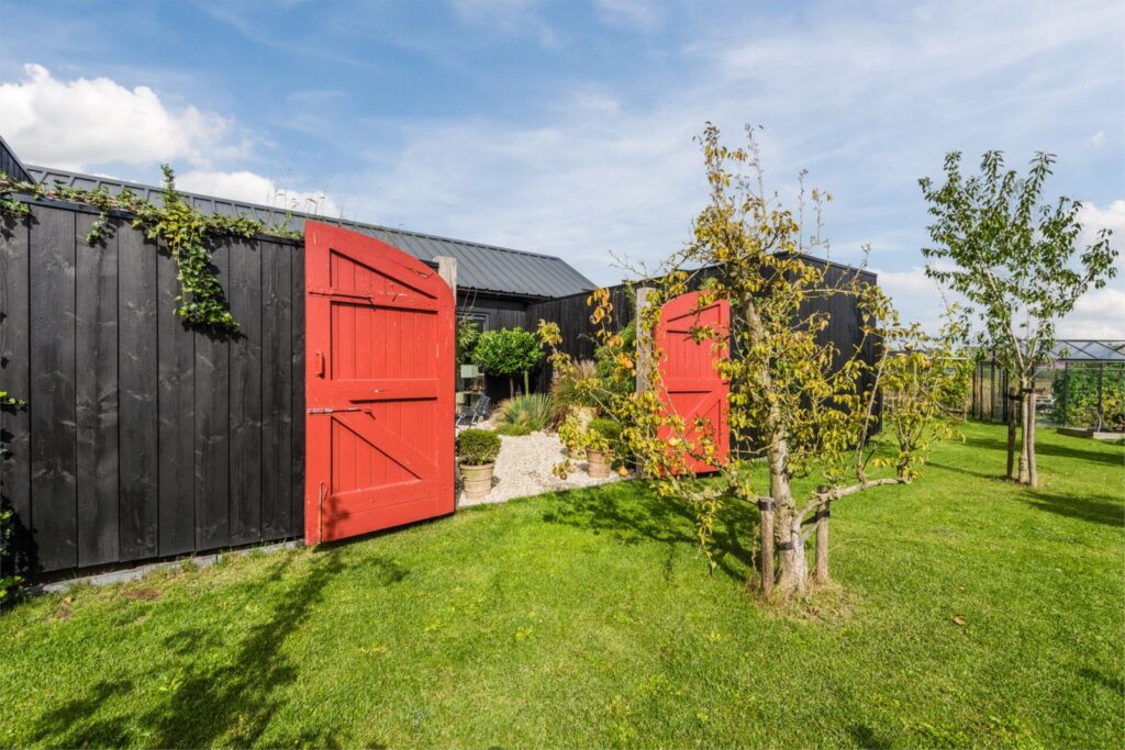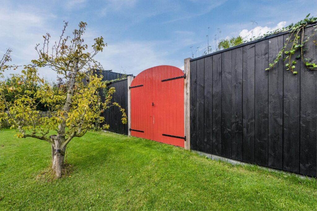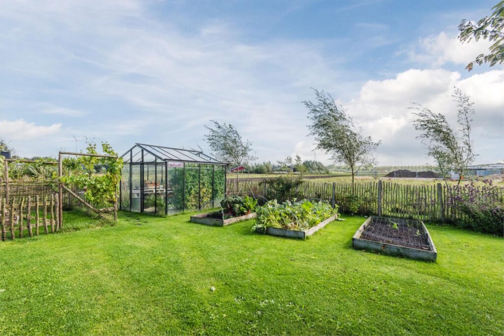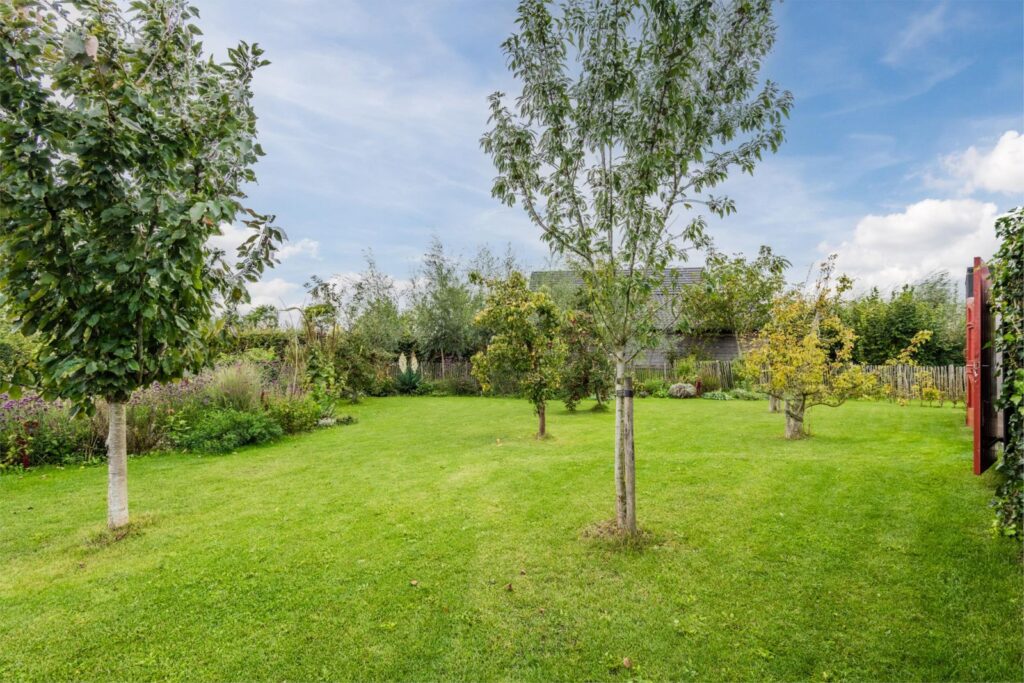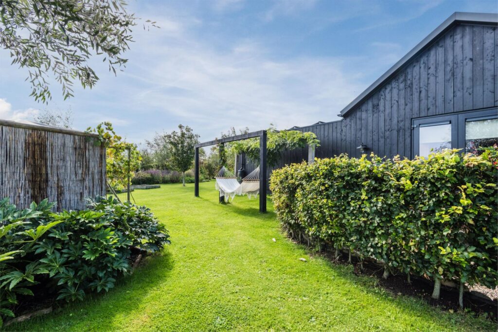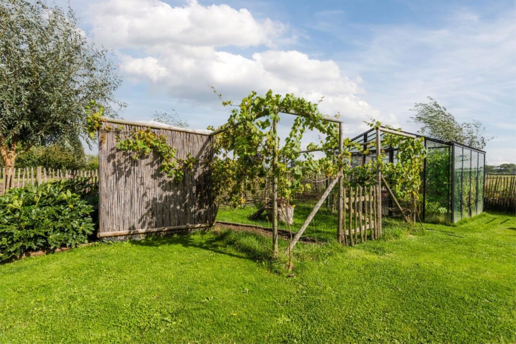 De kavel is volledig omheind met rustiek kastanjehouten schapenhek en beukenhaag.