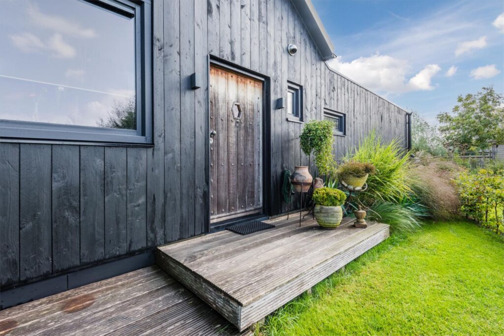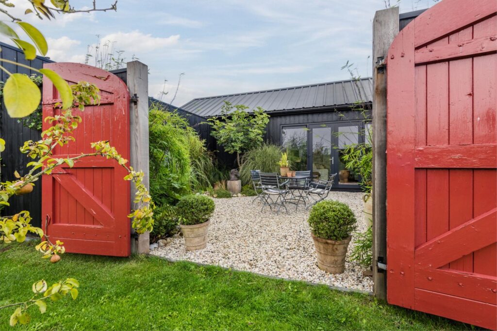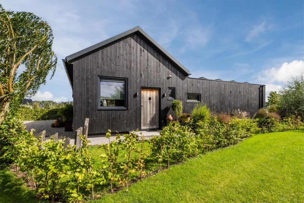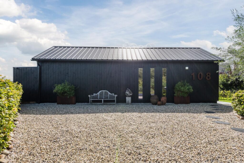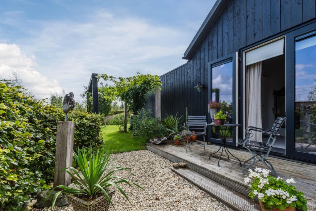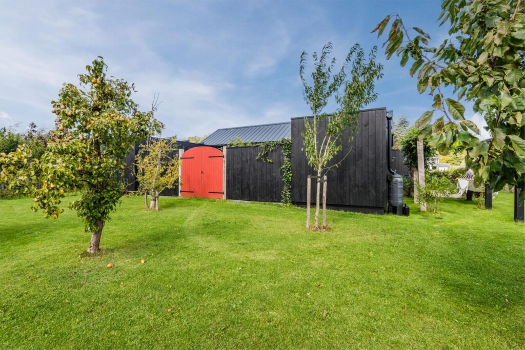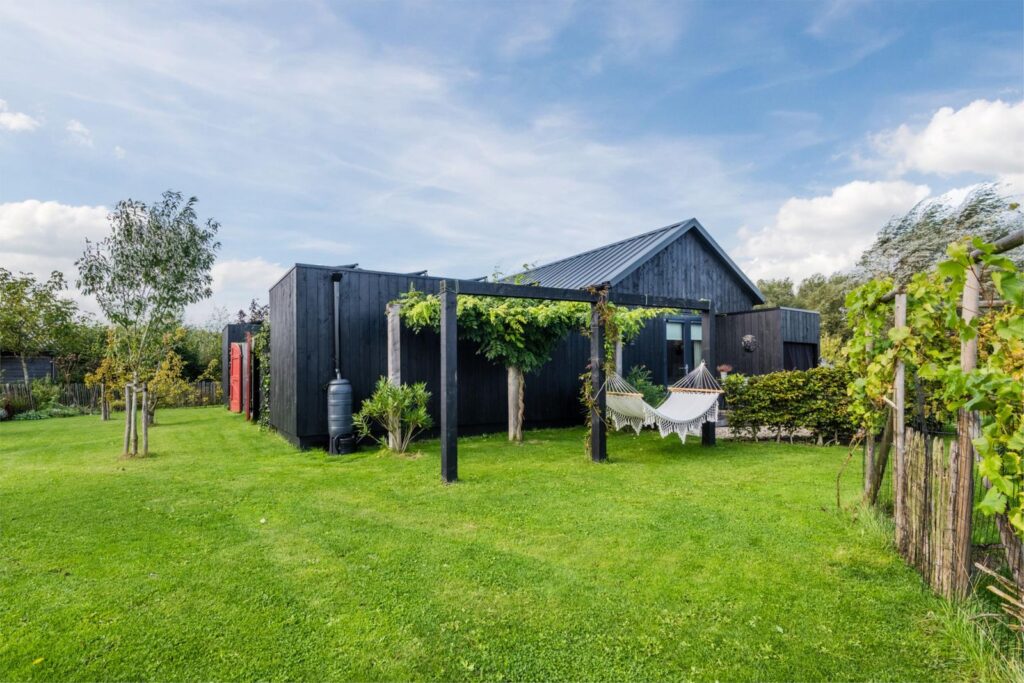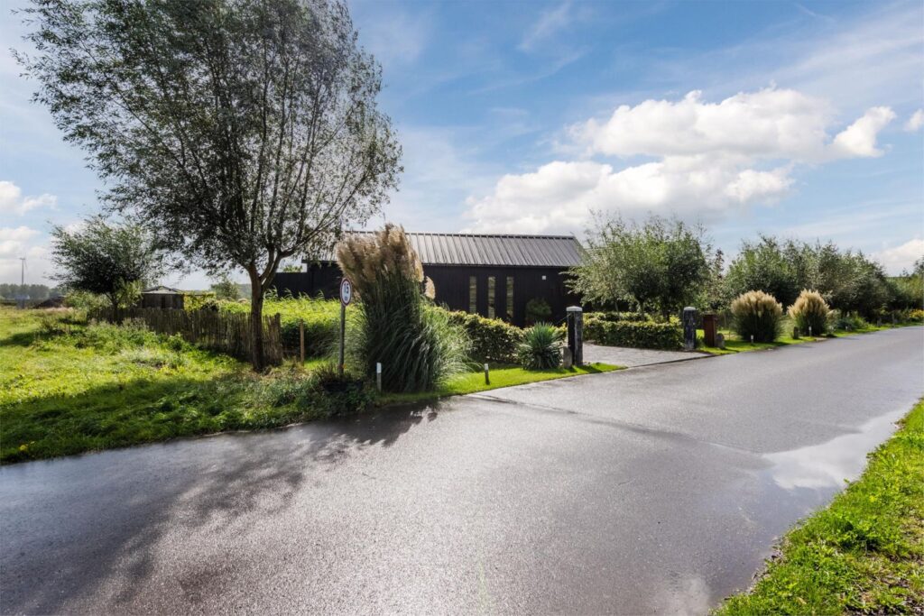 De kavel is volledig omheind met rustiek kastanjehouten schapenhek en beukenhaag.