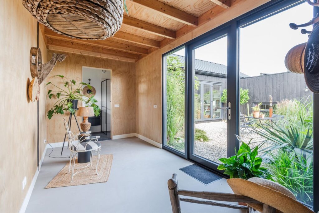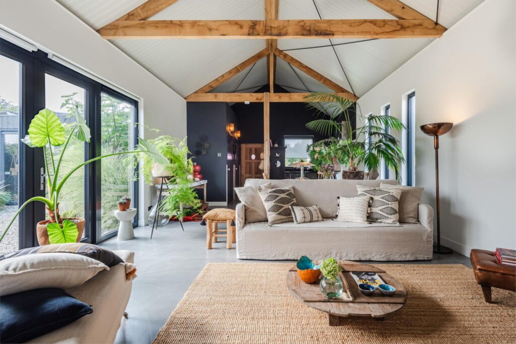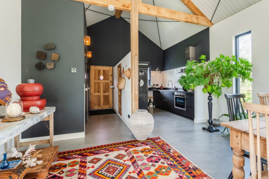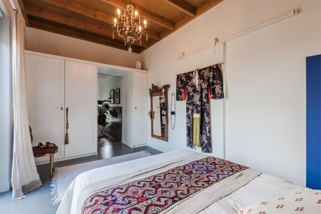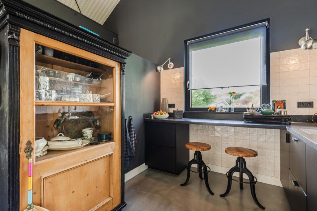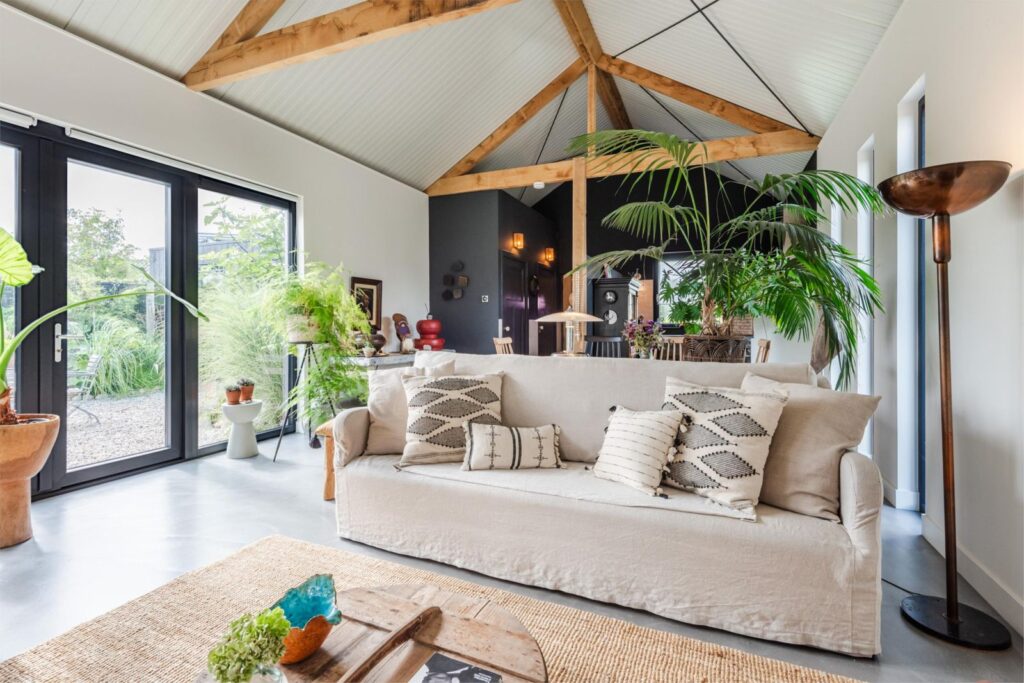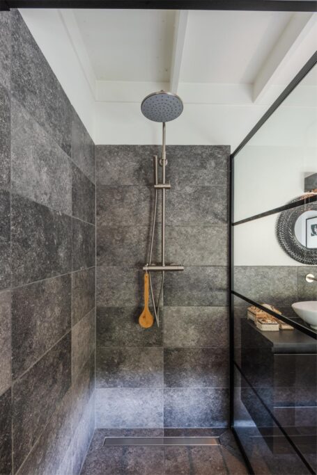 In deze loftwoning waar de ruimtes in elkaar over lopen , zijn meerdere oude bouwmaterialen verwerkt, franse eikenhouten voordeur, paneeldeuren, eiken balkconstructie en een belgische hoevepoort om de binnentuin af te sluiten.