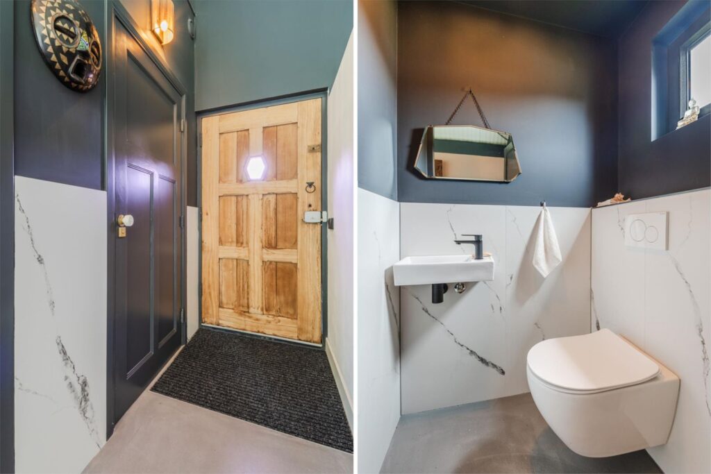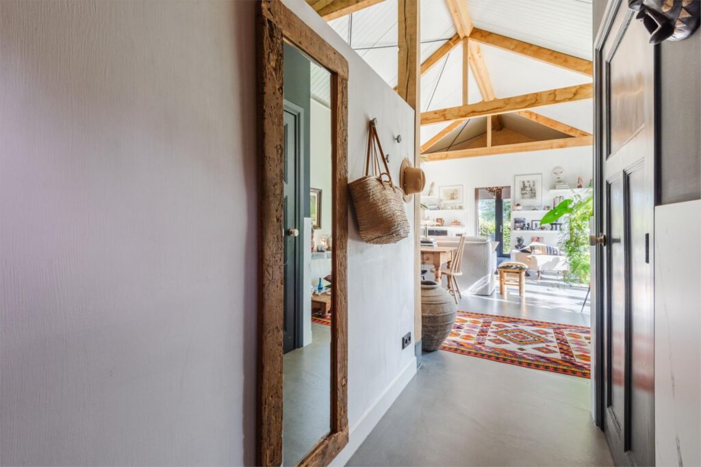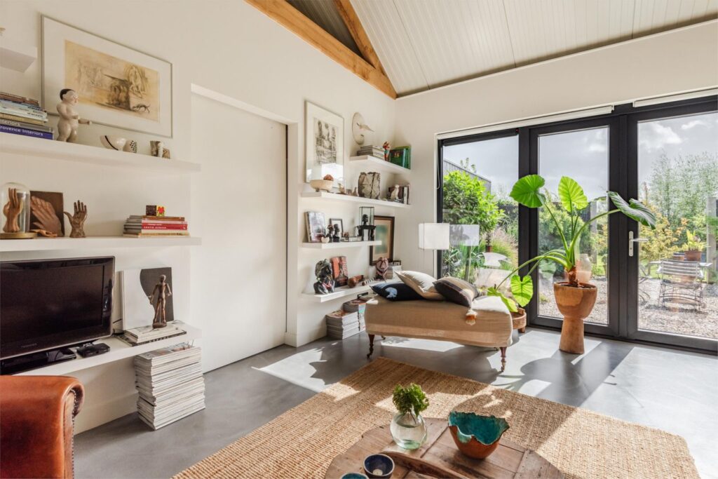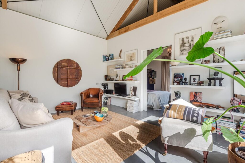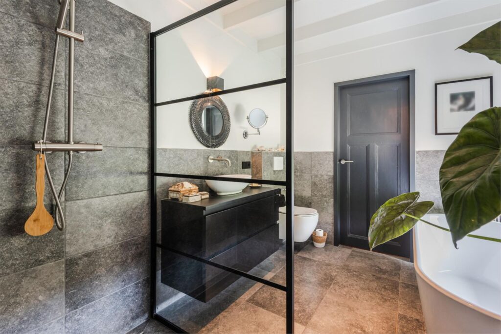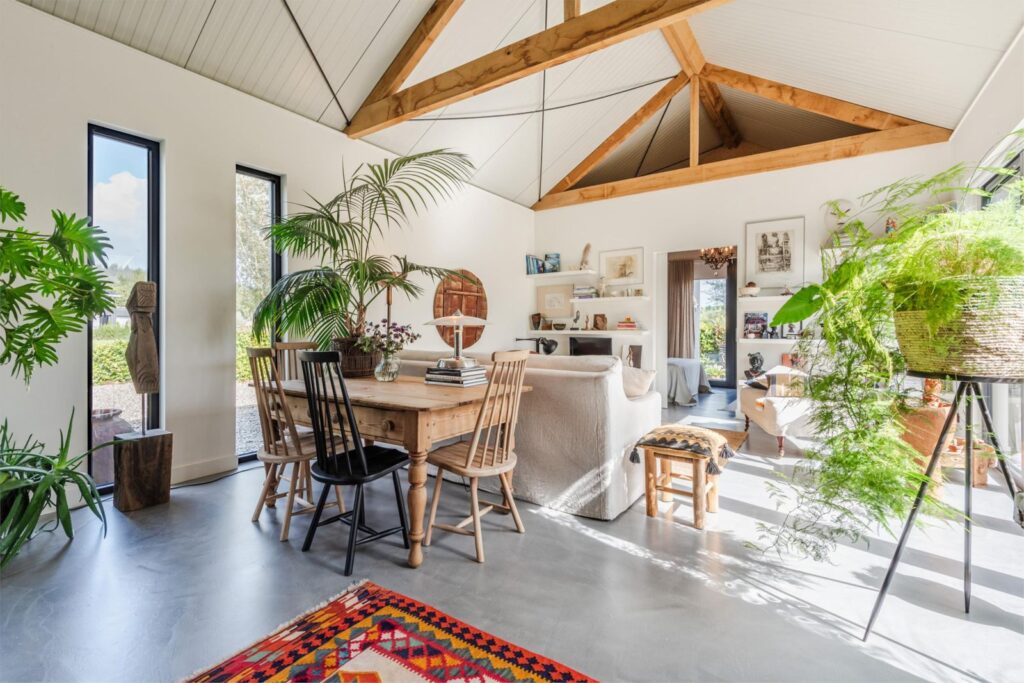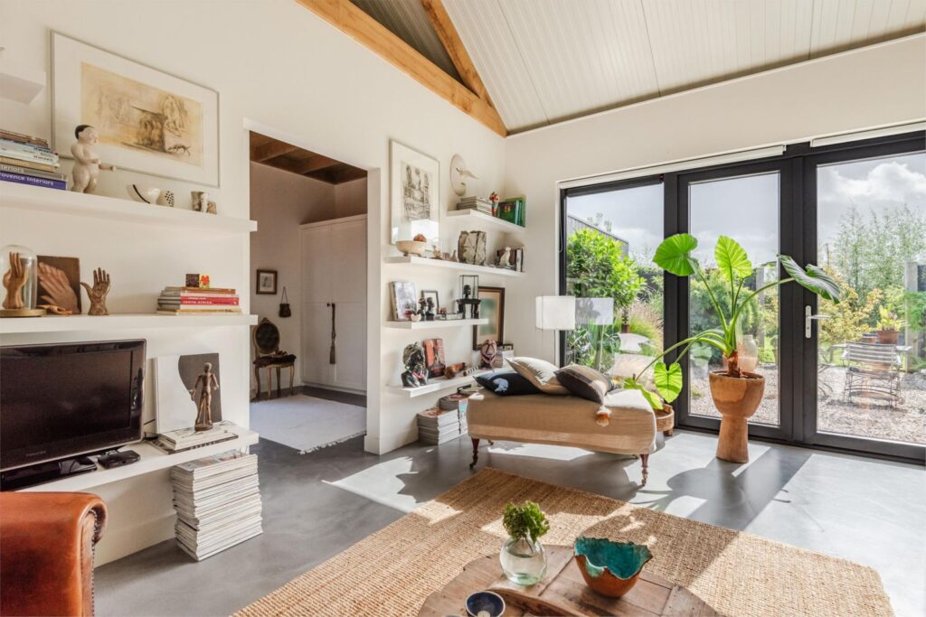 In deze loftwoning waar de ruimtes in elkaar over lopen , zijn meerdere oude bouwmaterialen verwerkt, franse eikenhouten voordeur, paneeldeuren, eiken balkconstructie en een belgische hoevepoort om de binnentuin af te sluiten.