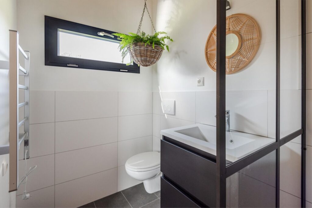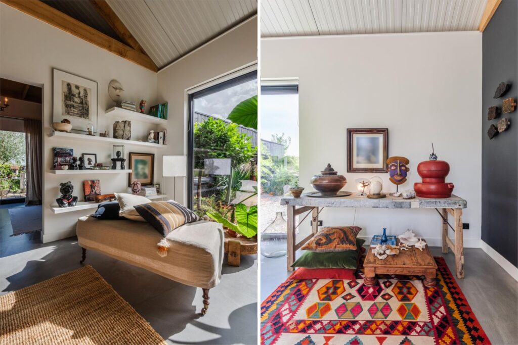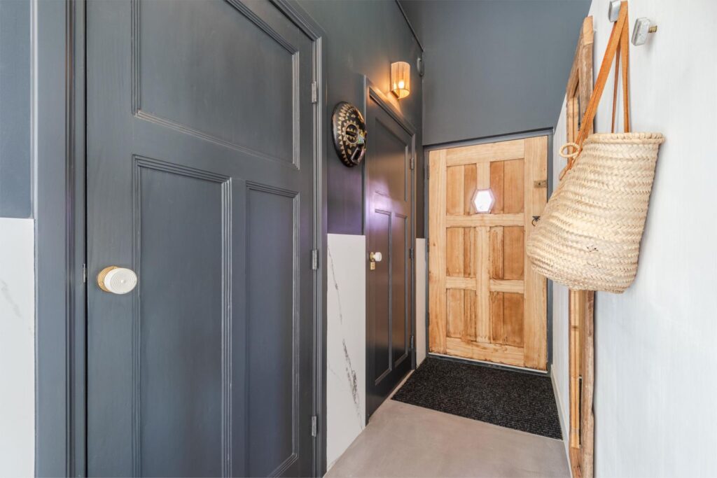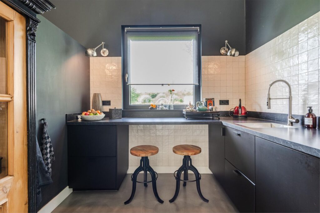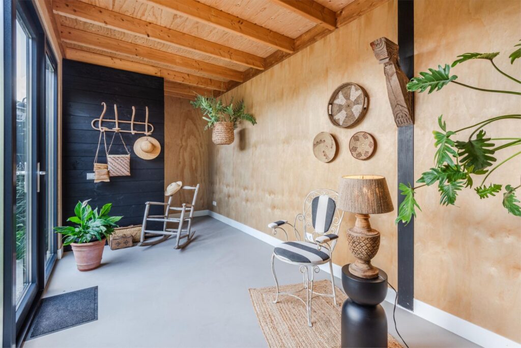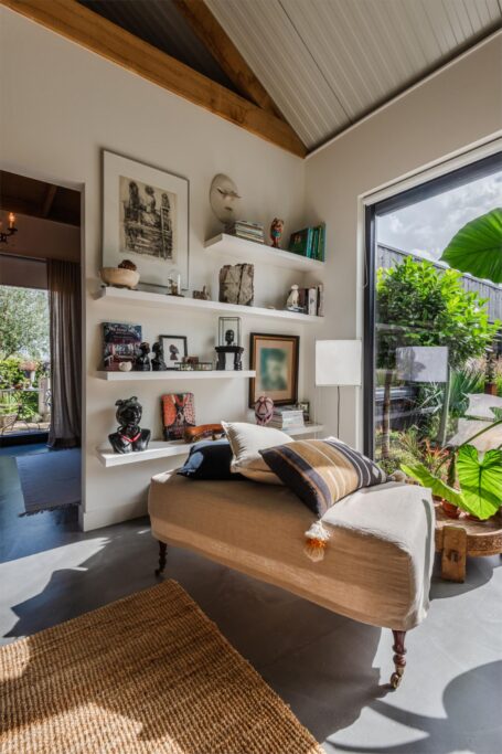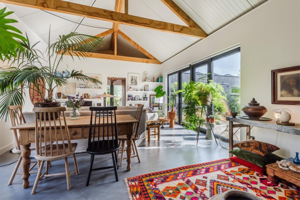 In deze loftwoning waar de ruimtes in elkaar over lopen , zijn meerdere oude bouwmaterialen verwerkt, franse eikenhouten voordeur, paneeldeuren, eiken balkconstructie en een belgische hoevepoort om de binnentuin af te sluiten.