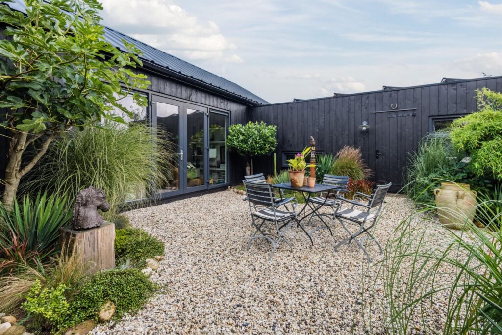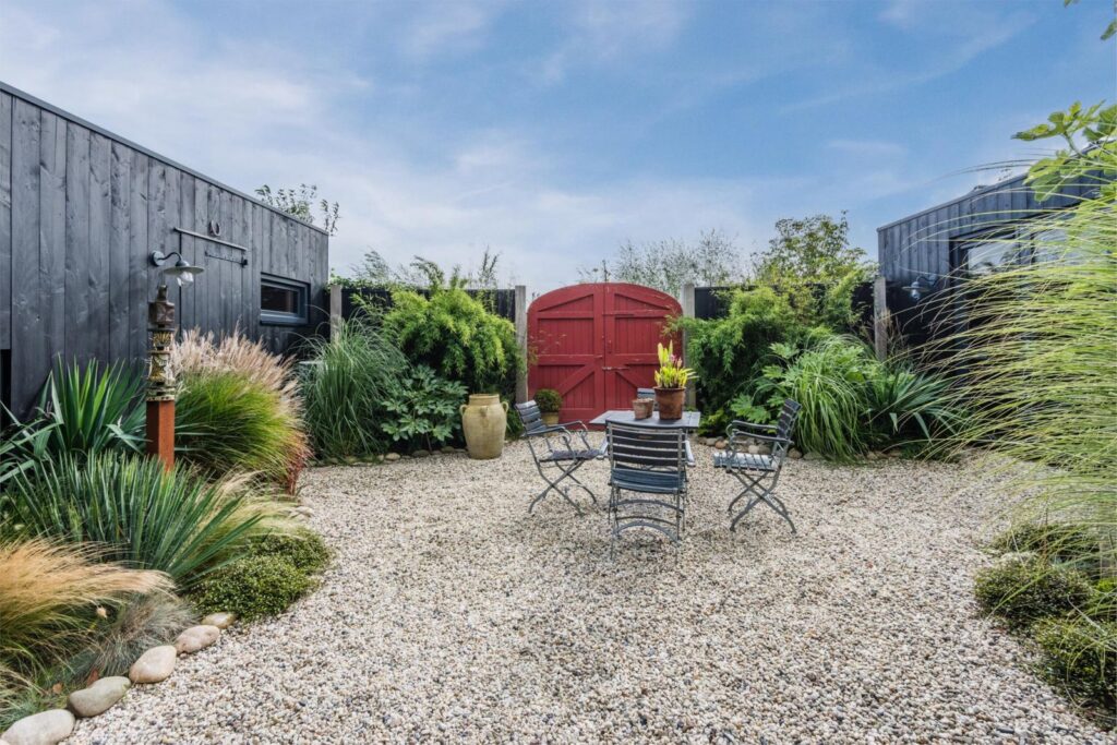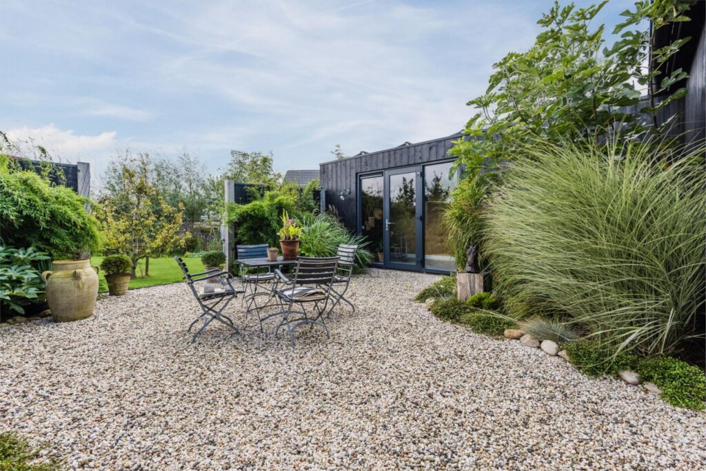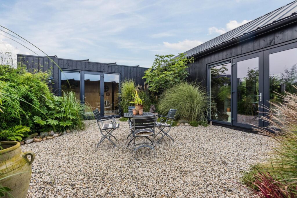 De woning is gebouwd in een U vorm met een afsluitbare binnentuin welke een tropische sfeer heeft met bamboe, grassen, vijgenboom en meer groenblijvende planten.