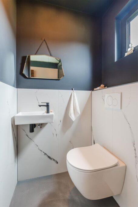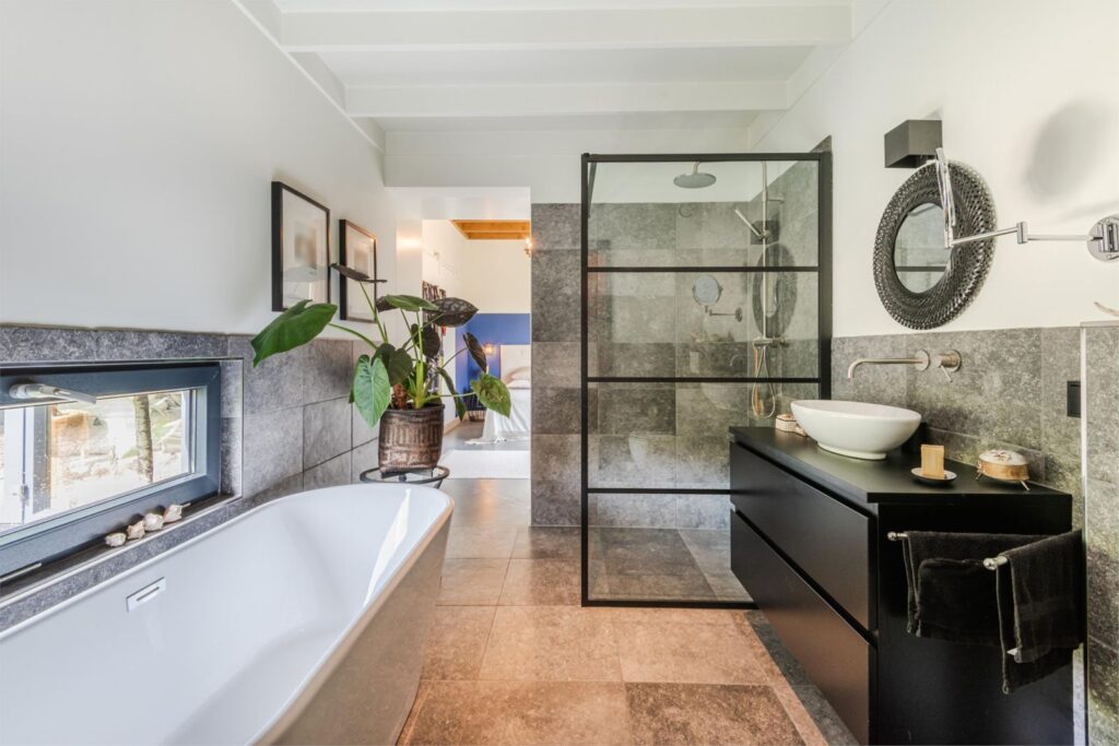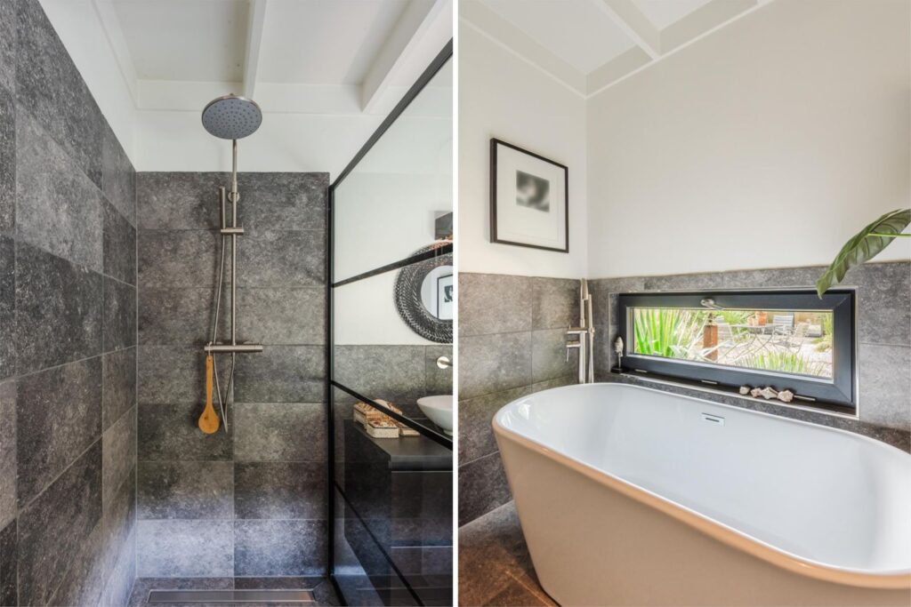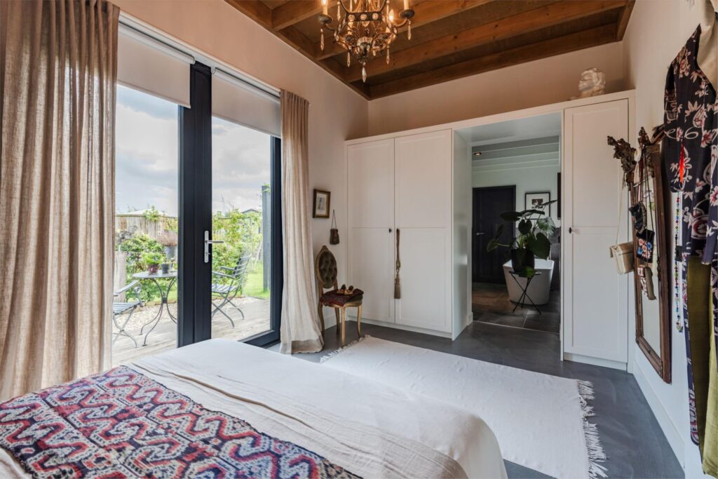 De ruime ruime slaapkamer heeft ook openslaande deuren naar een terras. Door de grote inbouwkast kom je in de badkamer met belgisch hardstenen tegels op wand en vloer, een vrijstaand ligbad, inloopdouche, wastafelmeubel en een hangend closet. De bijkeuken heeft een opstelplaats voor de wasmachine, een aanrechtblok, tevens bevinden zich hier de warmtepomp, mechanische afzuiginstallatie en de omvormer van de zonnepanelen.