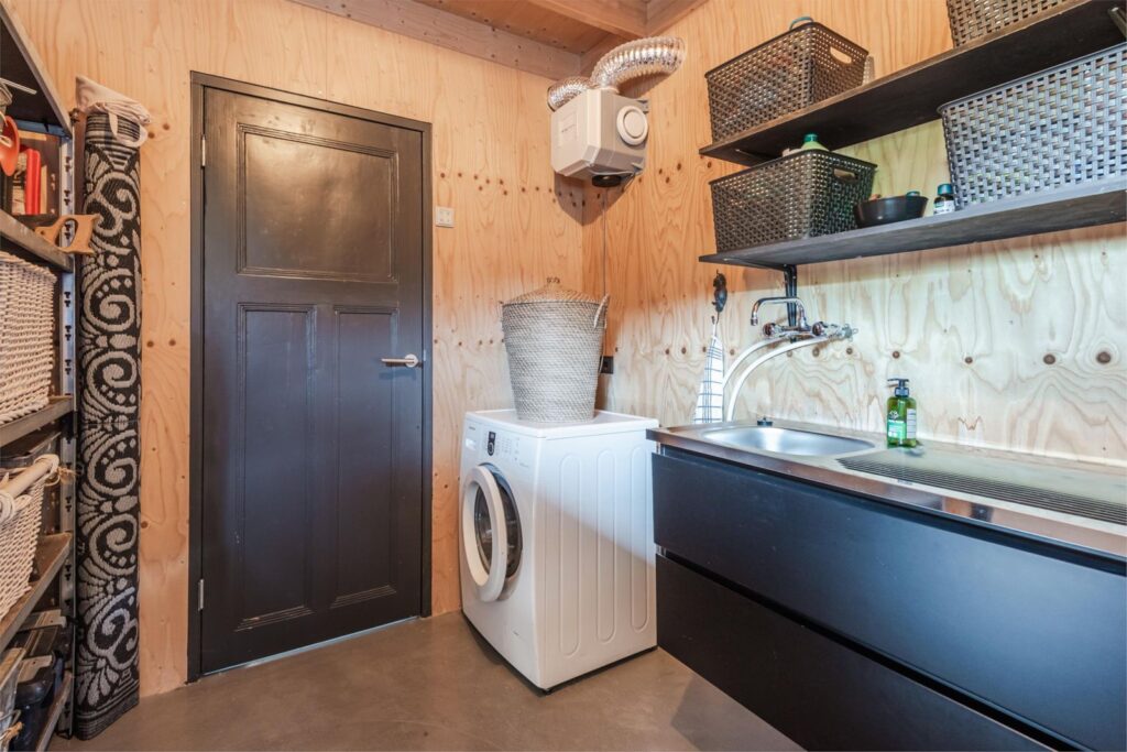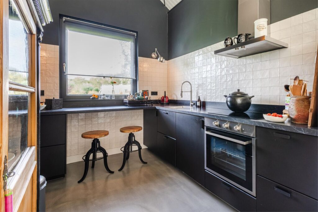De keuken is uitgerust met een inbouw koelkast, oven, inductiekookplaat en afzuigkap.