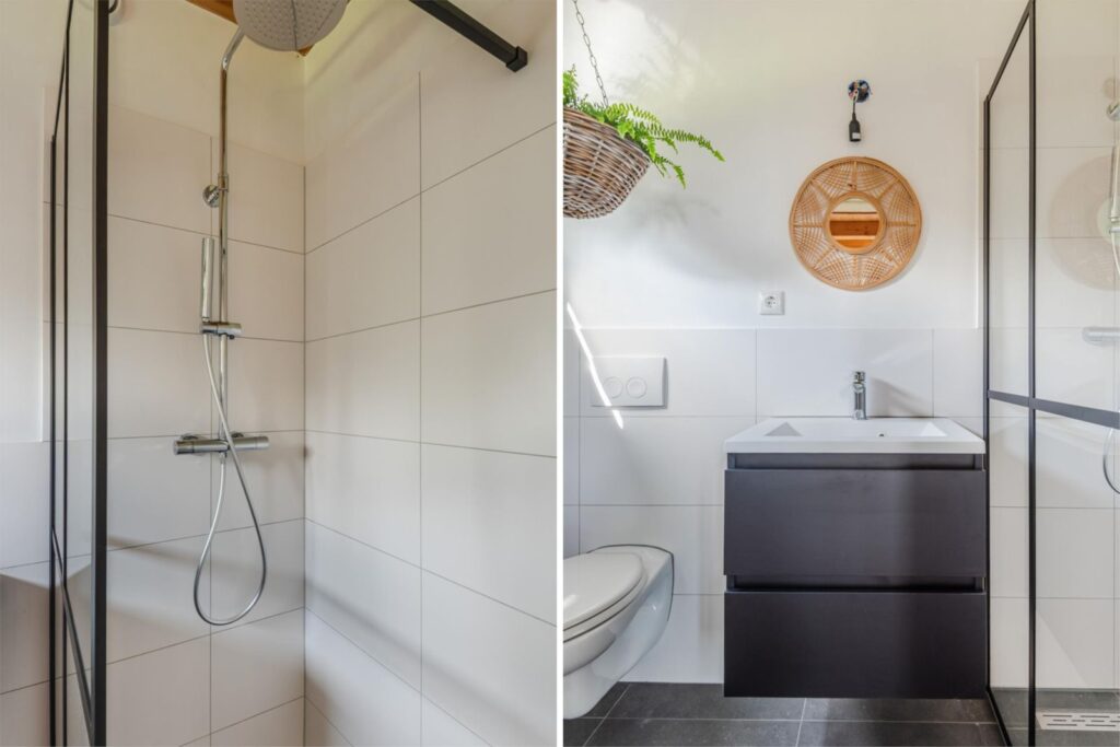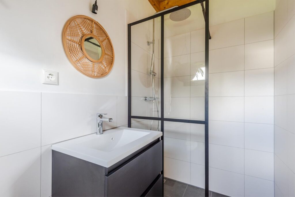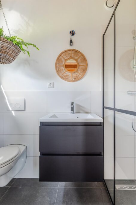 Aan de binnentuin grenst de tweede slaapkamer/gastenkamer met eigen ingang en badkamer voorzien van inloopdouche, wastafelmeubel en hangend closet.