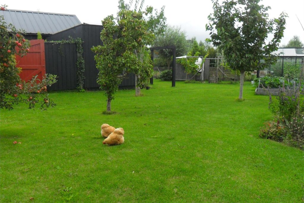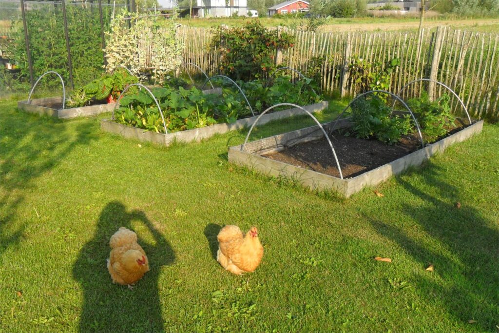 Er staat een kas van 3 bij 3 m. en een ruime kippenren welke begroeid is met een druif.