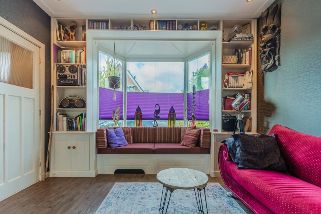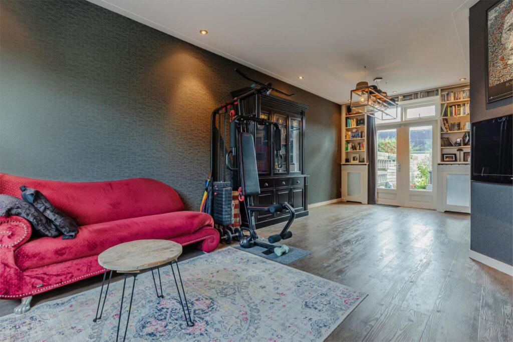 - Fraai stucplafond in woonkamer met 10 inbouwspots en Amsterdamse plinten.