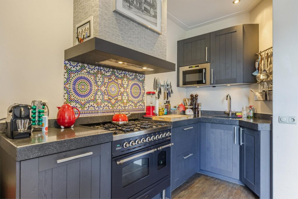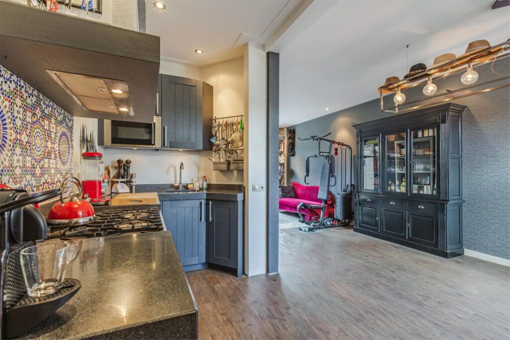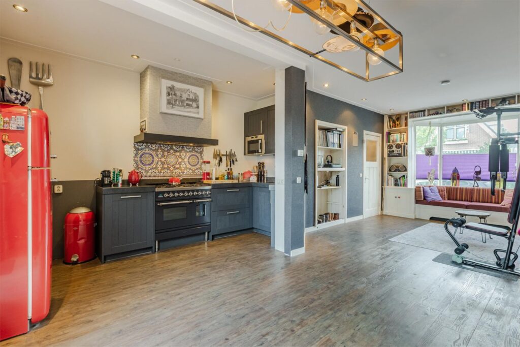 Begane grond: Entree, hal met kapstok en meterkast en deur naar de L-vormige woonkamer met een mooie antraciet kleurige open keuken met natuurstenen aanrecht en dito wasbak en voorzien van een vaatwasser, magnetron en 6 pits gasfornuis van het Italiaanse merk Boretti met 2 elektrische ovens, boven het fornuis een afzuigkap verwerkt in een stoere grote schouw, in de hoek van de open keuken bevind zich het toilet. Aan de voorzijde een nieuwe erker met gezellige erkerbank en aan de andere zijde van de woonkamer twee openslaande deuren richting de ruime tuin.