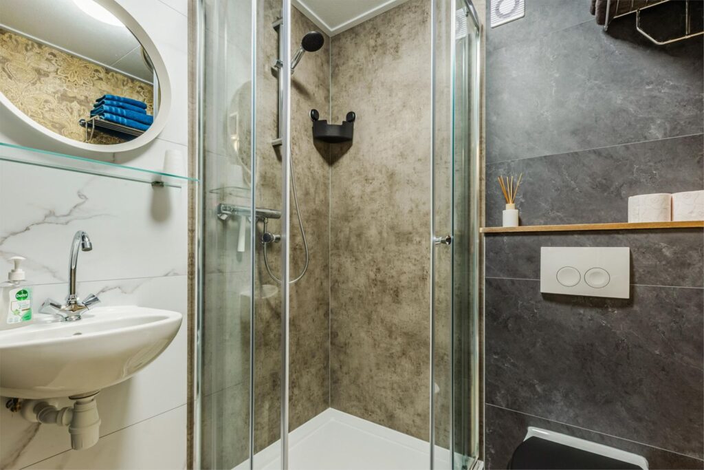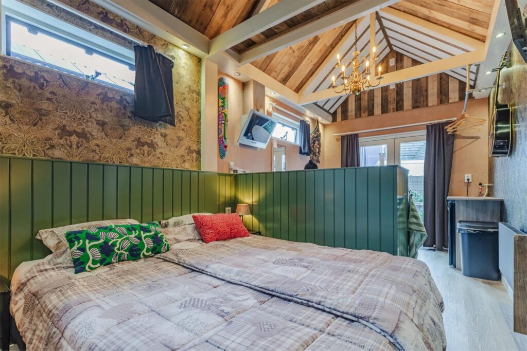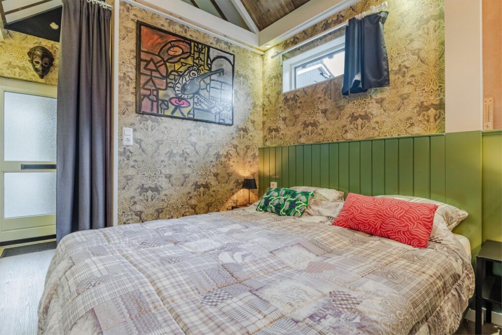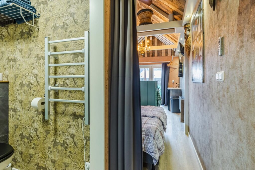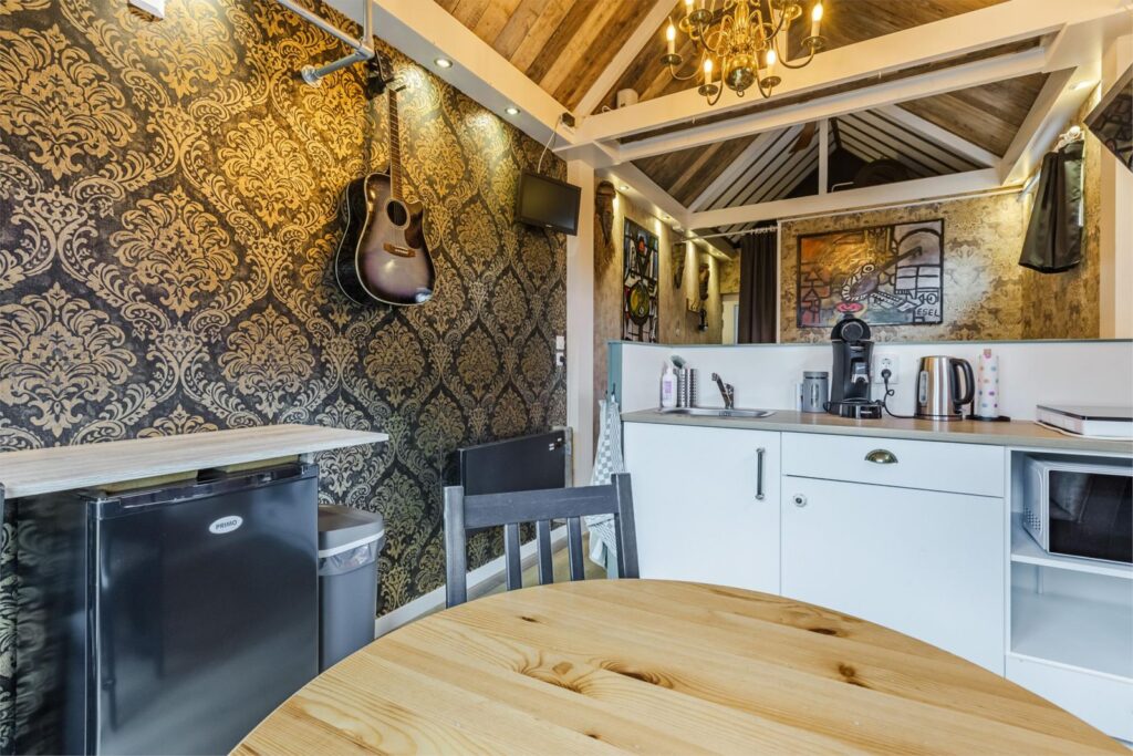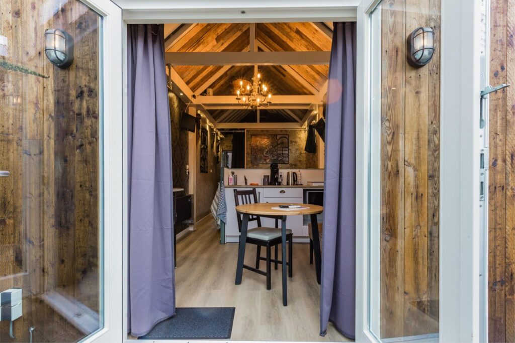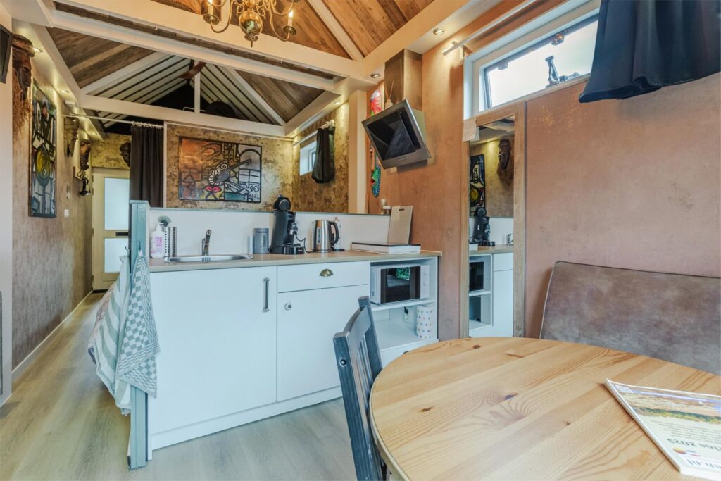 De indeling van het huisje is als volgt: Entree, hal met kapstok en aan de linkerzijde de badkamer met douchecabine, wastafel en toilet, de gehele badkamer is bekleed met prachtige kunststof wandpanelen in verschillende designs. Direct daarna een tweepersoonsbed van 180 X 200 cm, daarna een lage scheidingswand met kitchenette voorzien van aanrecht met wastafel, koelkast, 2 pits inductie kookplaat, magnetron en 2 lades plus 2 kastjes, aansluitend een kleine zithoek met twee openslaande deuren richting de tuin. binnen dit prachtige huisje kijk je de hoogte in naar het prachtige met hout beklede zadeldak met balkenconstructie. Het huisje is voorzien van een 100 liter boiler en een elektrische wandkachel.