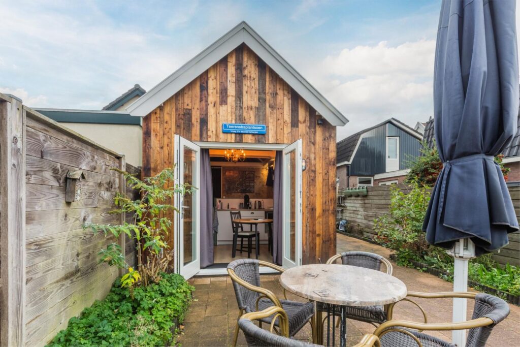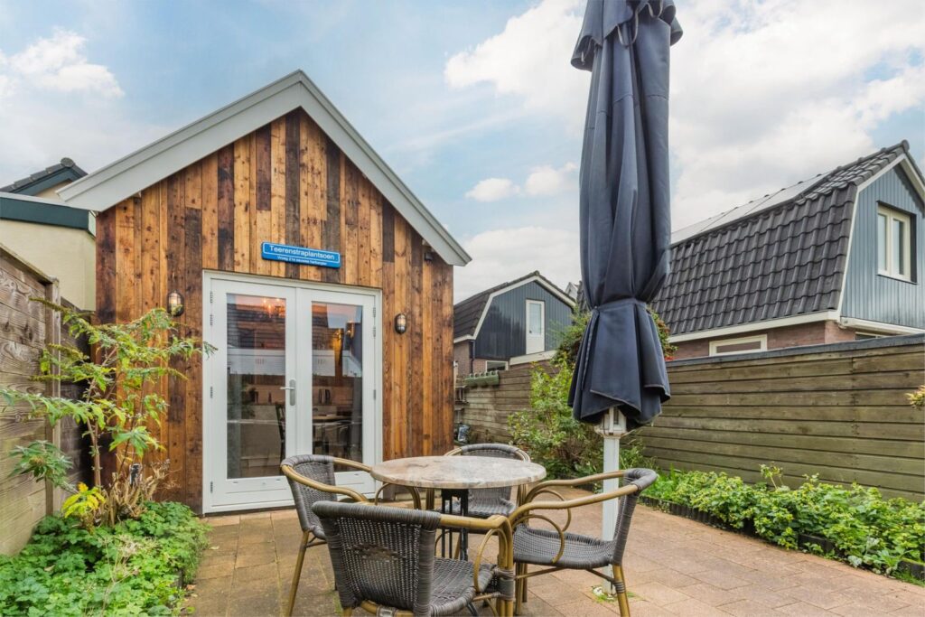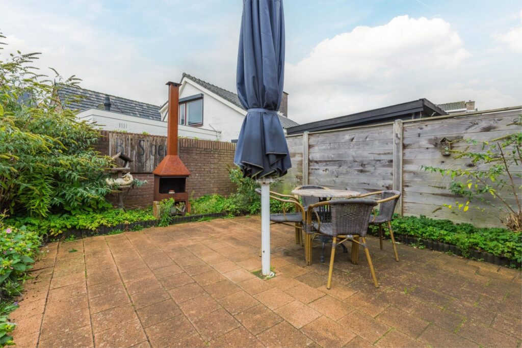 De onderhoudsvriendelijke achtertuin is gelegen op het oosten en heeft het grootste deel van de dag zon, Je hebt hier volop privacy. De tuin is vanuit de woonkamer te bereiken via twee openslaande deuren en via de eigen steeg aan de rechterzijde van de woning. In de tuin staat een prachtig met hout bekleed Tiny house met twee openslaande deuren richting het achterste deel van de tuin, via de steeg bereik je de voordeur van dit prachtige huisje wat van alle gemakken is voorzien, de tuin meet achterin 6.35 diep en 5.90 breed en aan de zijkant van het huisje is de buitenruimte 9.52 diep en 2.80 breed.
