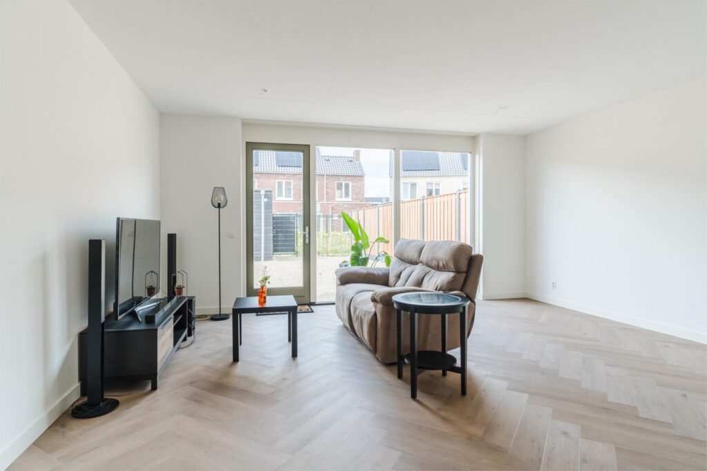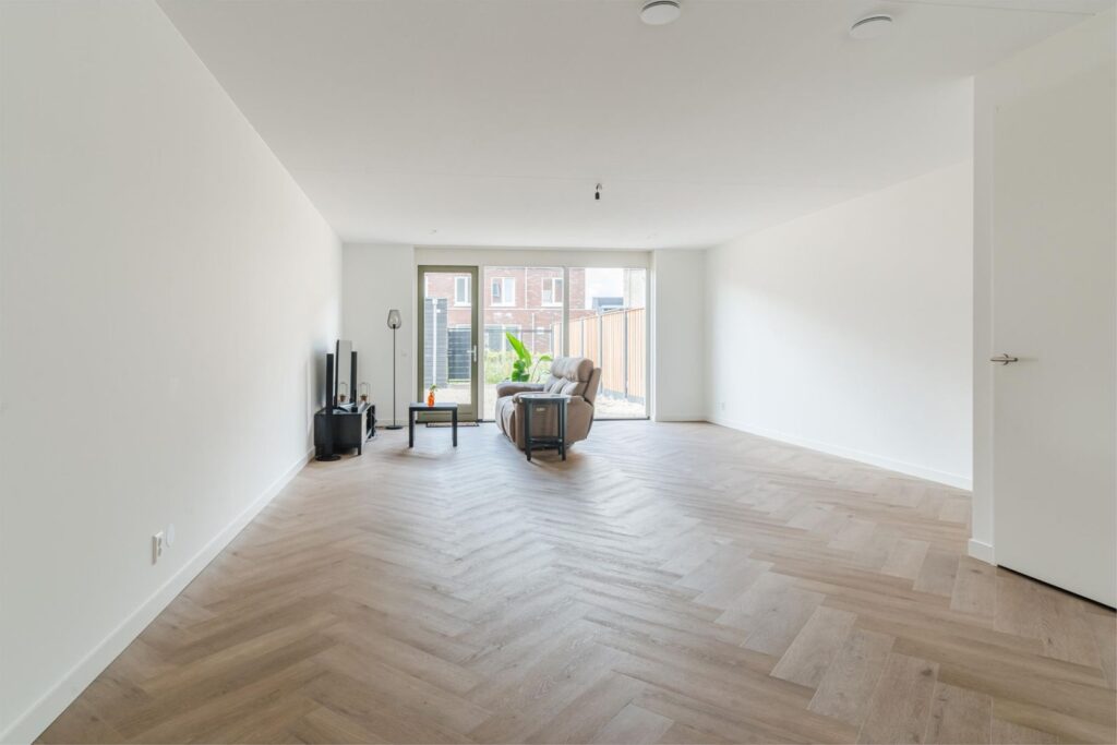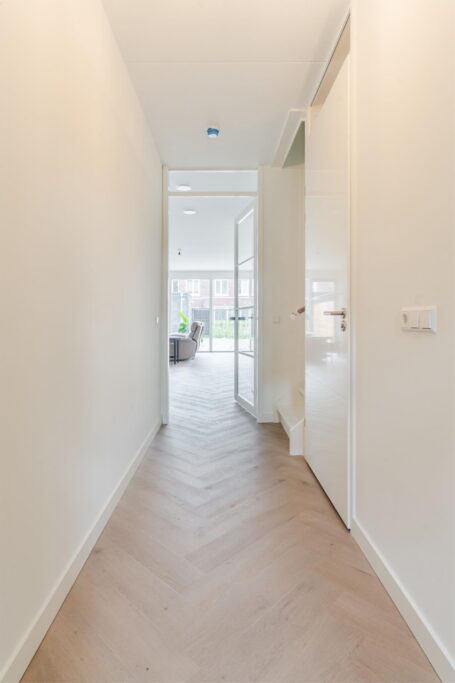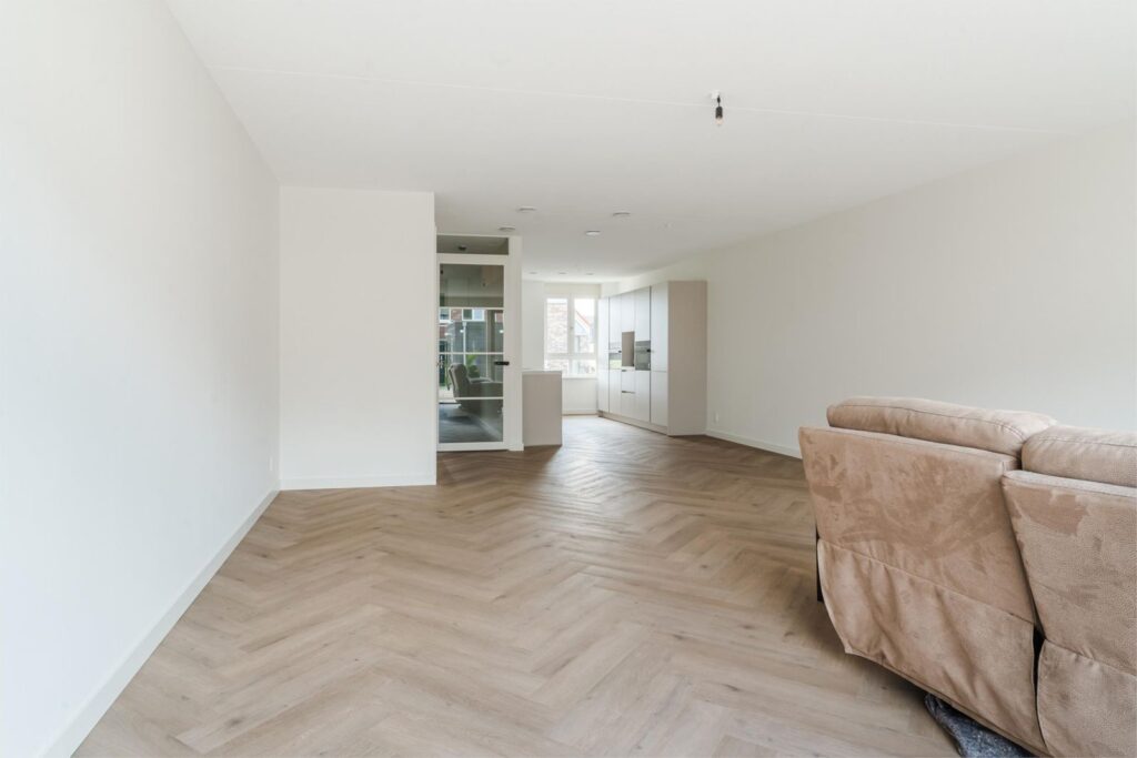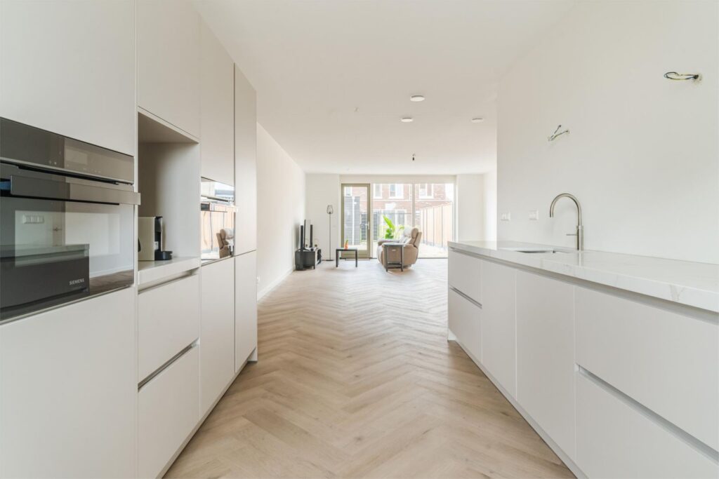 Binnen stap je in een lichte, ruime woning met een uitgebouwde woonkamer en een stijlvolle, compleet ingerichte keuken in zachte casmirkleur. Er is veel kastruimte, moderne apparatuur en volop ruimte om samen te koken en te leven. Alles is afgewerkt met oog voor detail: glad gestucte en gesauste wanden, keurig timmerwerk en een PVC-visgraatvloer die direct bij binnenkomst een verzorgde indruk geeft.