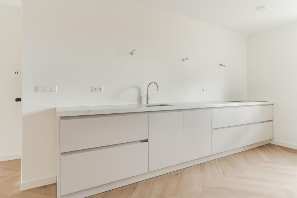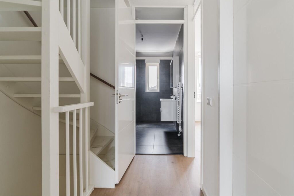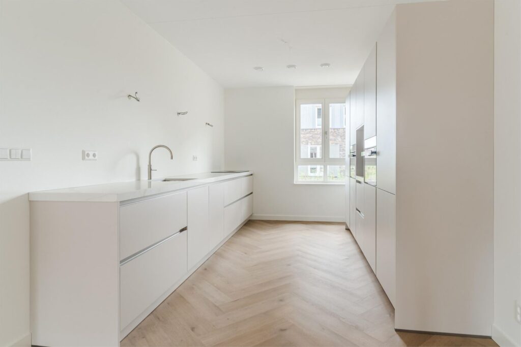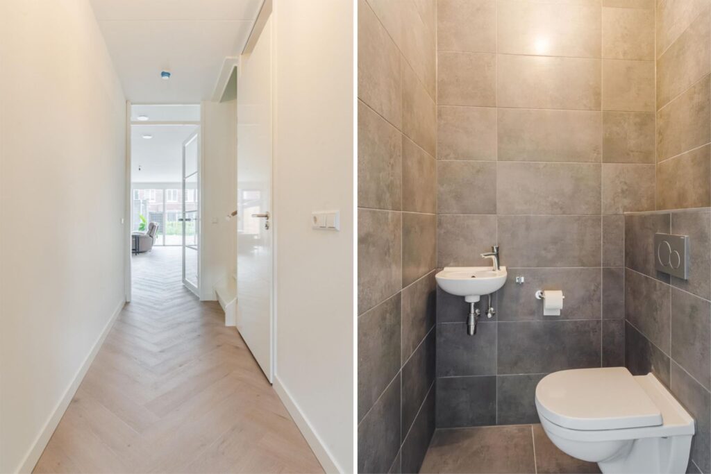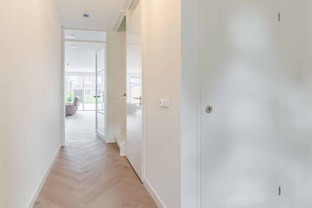 Binnen stap je in een lichte, ruime woning met een uitgebouwde woonkamer en een stijlvolle, compleet ingerichte keuken in zachte casmirkleur. Er is veel kastruimte, moderne apparatuur en volop ruimte om samen te koken en te leven. Alles is afgewerkt met oog voor detail: glad gestucte en gesauste wanden, keurig timmerwerk en een PVC-visgraatvloer die direct bij binnenkomst een verzorgde indruk geeft.