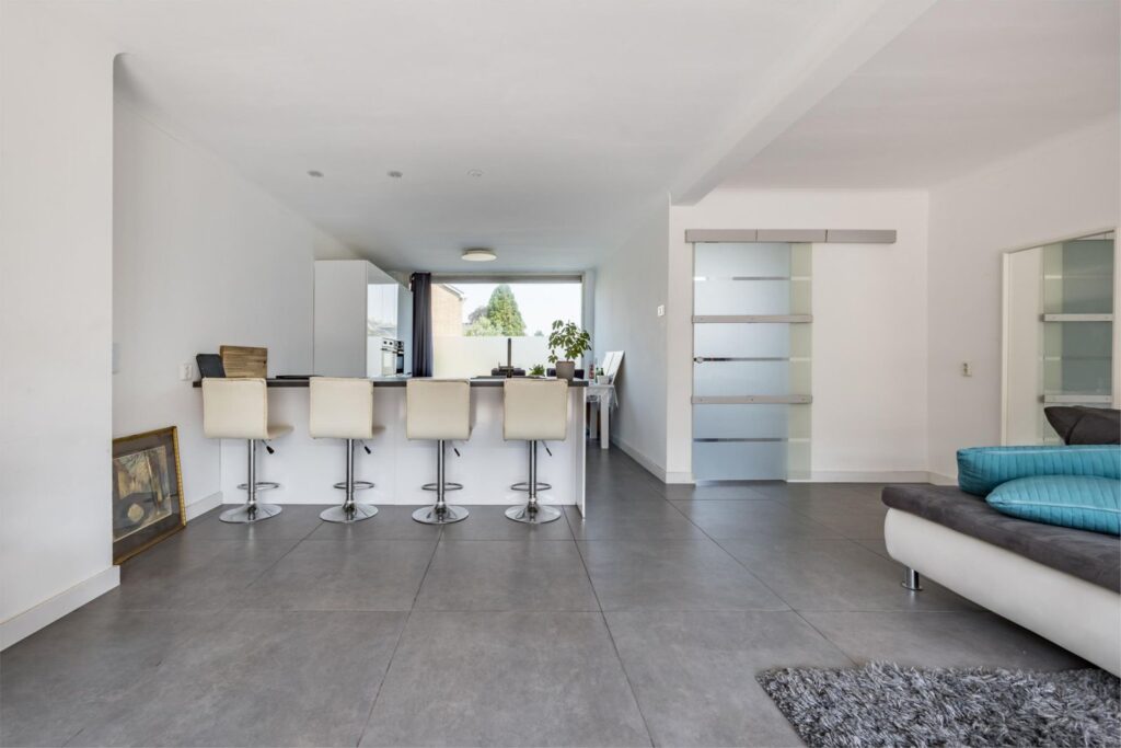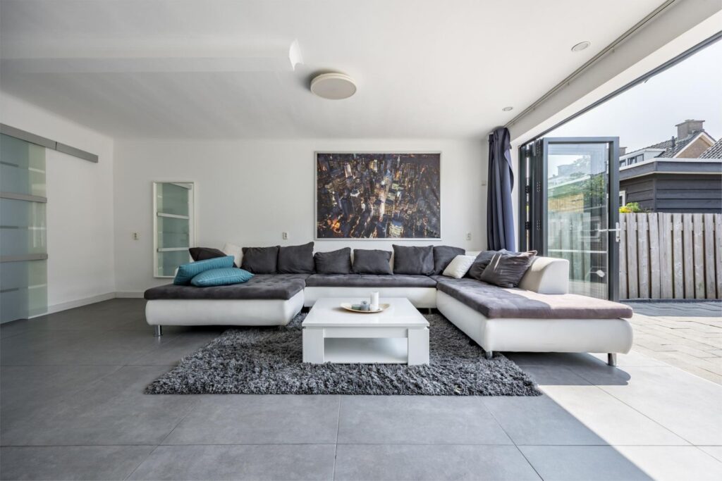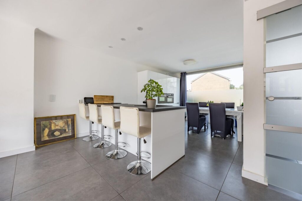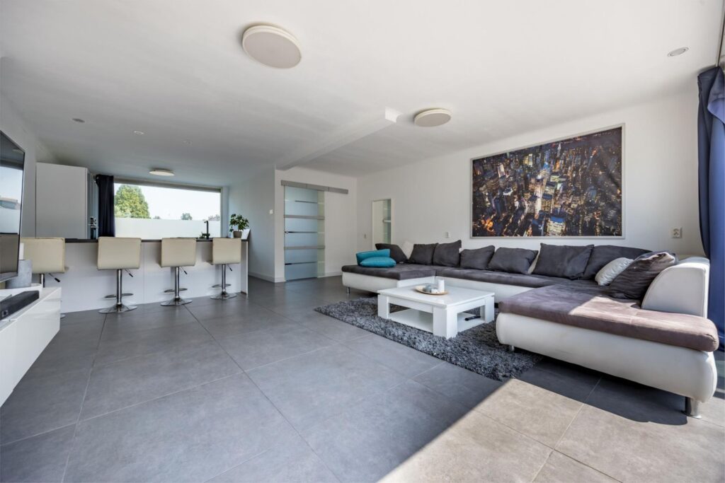 Woonkamer: Een ruime en stijlvolle woonkamer met een grote uitbouw aan de achterzijde. Een stijlvolle roomdivider maken dit een gezellige plek. De vloerverwarming en strakke afwerking van wanden en plafond zorgen voor een luxe uitstraling.
