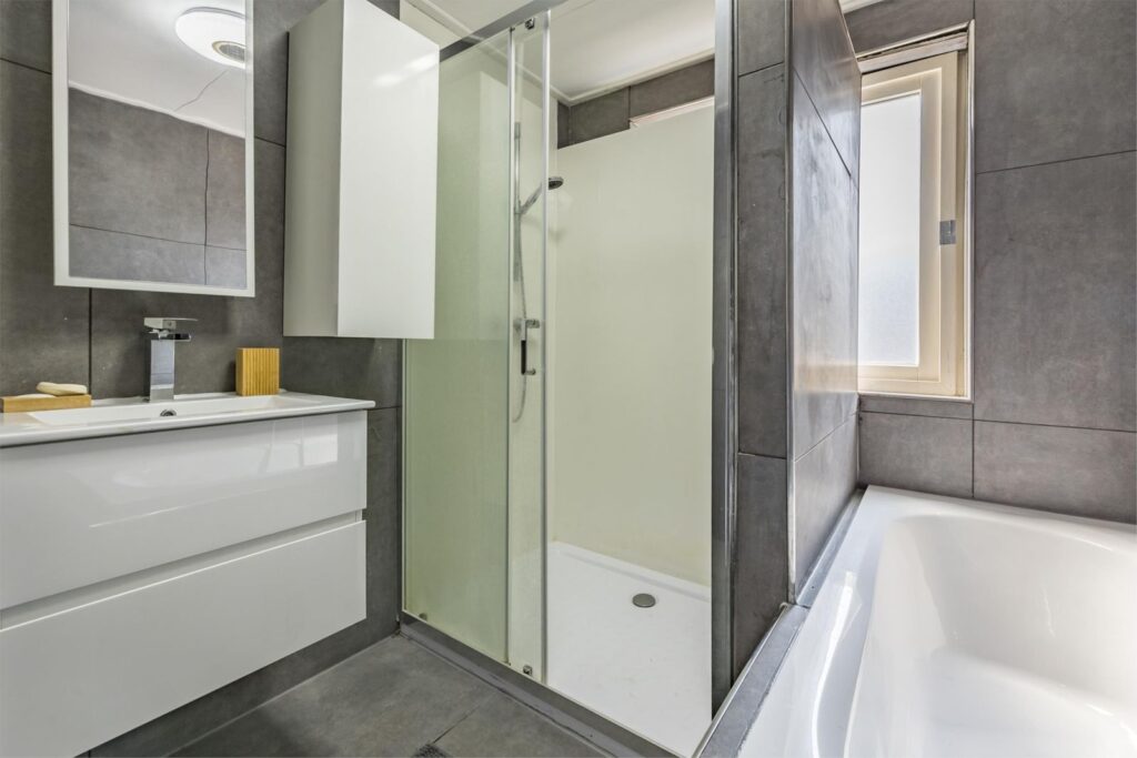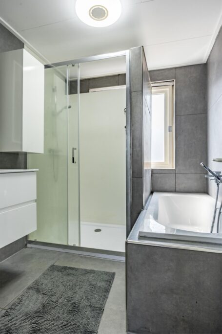 Badkamer: Modern en praktisch, met een inloopdouche en bad en een speels badkamermeubel en een designradiator.