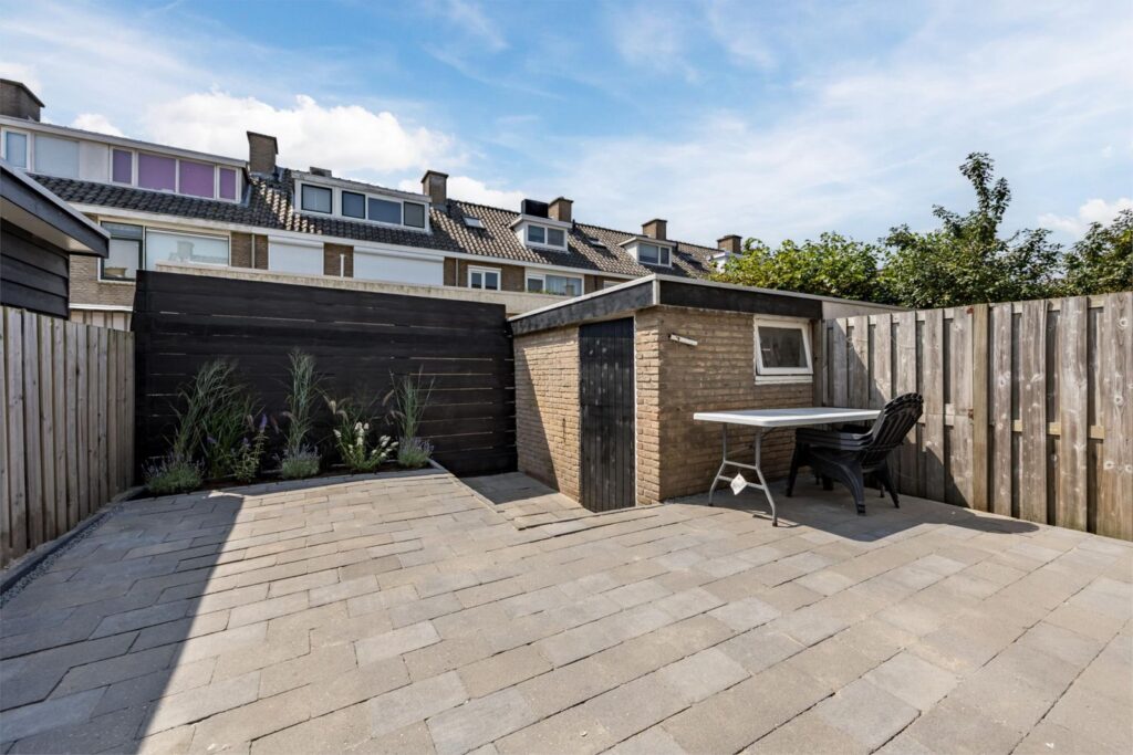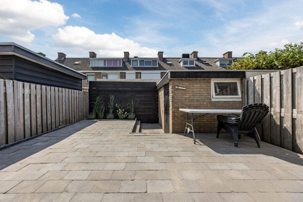 De achtertuin is voorzien van tegels, waar je ongestoord kunt genieten van de zon. Daarnaast beschikt de tuin over een ruime berging en voldoende plek om heerlijk tot rust te komen.