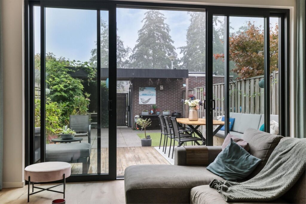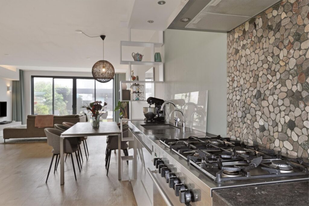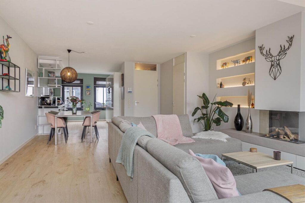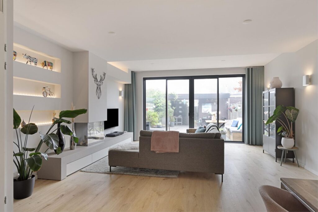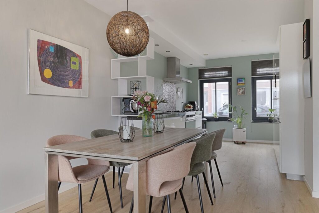 ruimte voor een grote eettafel met stoelen. De hele benedenverdieping is voorzien van vloerverwarming.