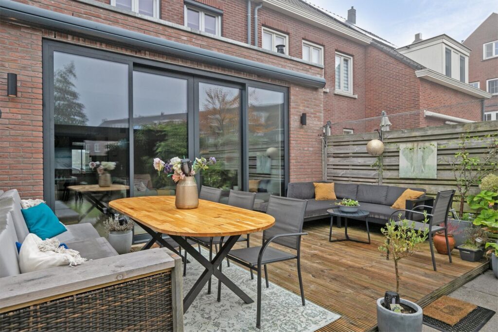 De tuin van 10 meter diep ligt op het zuiden. Zodra de zon schijnt kan je lekker in de tuin vertoeven. Het elektrische zonnescherm voorziet je van de nodige schaduw.