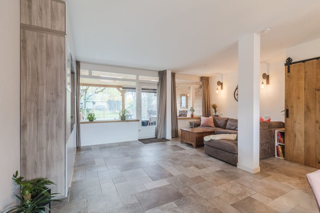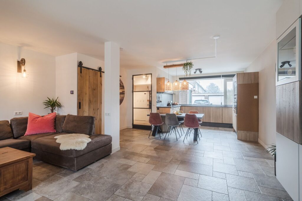 De lichte en ruime woonkamer biedt volop leefruimte en staat in open verbinding met de moderne keuken. De gehele begane grond is voorzien van comfortabele vloerverwarming. Vanuit de woonkamer loop je direct de tuin in.